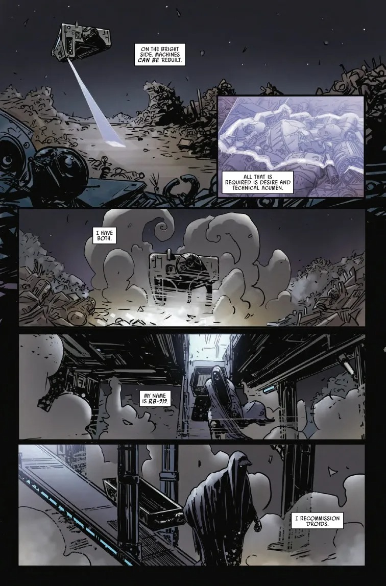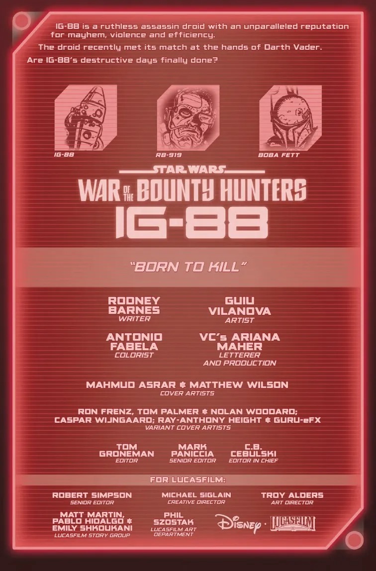 NO ONE CAN DEFEAT IG-88! IG-88 is an advanced assassin droid designed for death, destruction, and mayhem. Its weapons systems are unparalleled, its design flawless. Yet the galaxy’s most sinister droid bounty hunter can still fail. What motivates IG-88’s resurrection time and time again? Is it programming or something…more? And can IG-88 find a strategy to overcome its old foe, Boba Fett?! Rodney Barnes’ and Guiu Vilanova’s one-shot is the fourth of four action-packed “War of the Bounty Hunters” tie-ins about the criminal underworld’s most notorious hunters and scoundrels, all told by the best STAR WARS writers and illustrators in the galaxy.