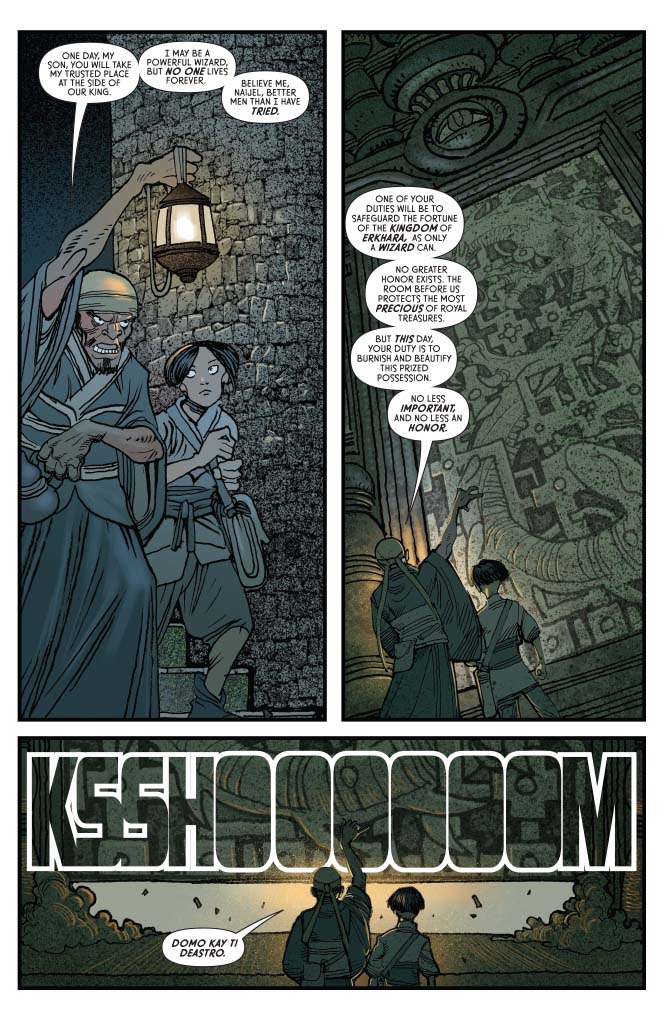 “Our award-winning duo of AMANDA CONNER and JIMMY PALMIOTTI continue Red Sonja’s mission to protect a young (and, shall we say, precocious?) princess as her wedding day arrives. But as the preparations for the festivities continue, a coveted icon of the kingdom is stolen and its protector, the Kings wizard, sets a bounty Red Sonja cannot resist. All this can be yours, featuring the strikingly beautiful sequential art of MORITAT and another killer cover by AMANDA CONNER and PAUL MOUNTS!”