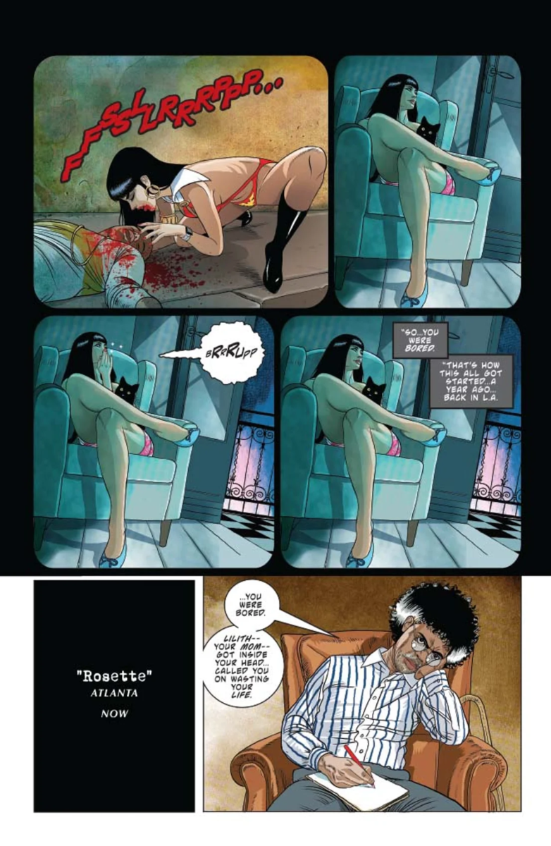 Vampirella’s struggle to deal with the complex emotional consequences of a major disaster caused by her enemies is exacerbated by an unexpected visit from her mother, Lilith, with whom Vampi has a… complicated relationship. But has the Mother of All Vampires come to help or destroy her daughter? And will Vampirella’s hapless therapist survive the encounter?