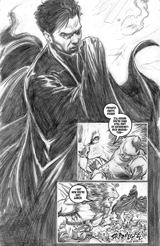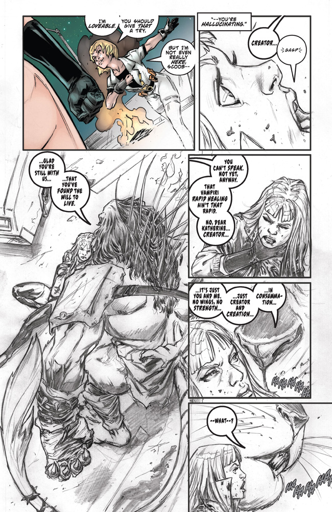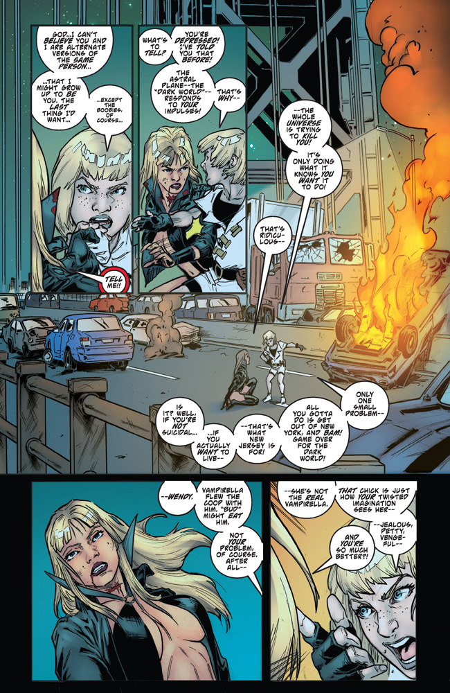 Dying from a deadly plague, Draculina has taken refuge within the astral plane known as the “Dark World” — only to find herself pursued by monsters created from her own childhood imagination! With her escape route blocked by a Dark World “Vampirella” formed from her own hateful imagination, the two sisters’ dark and twisted bond is explored in depth as Draculina struggles to tame the destructive impulse of her own psyche.