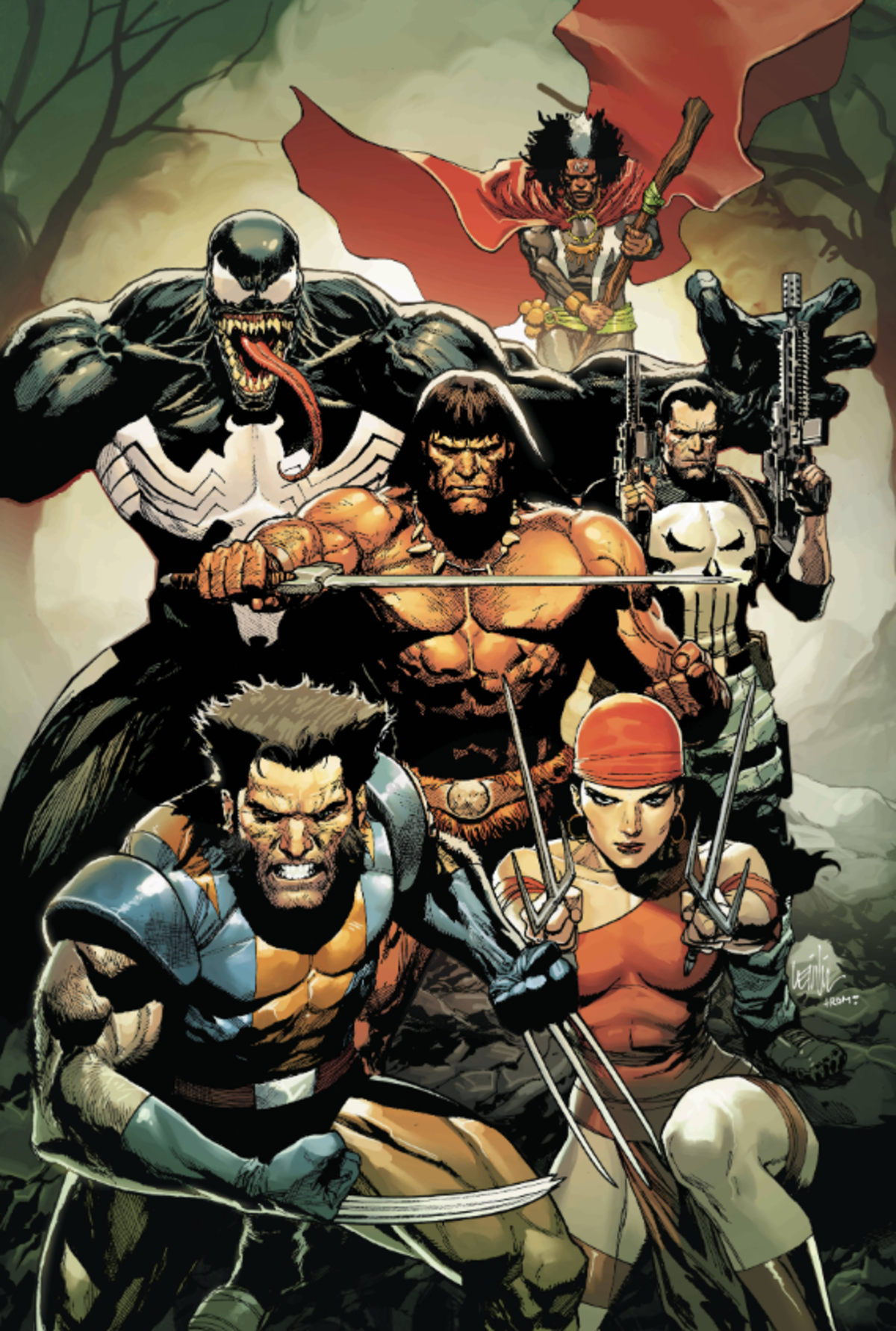The most savage, most unkillable team of characters in the Marvel Universe is assembled! Wolverine! Venom! Elektra! Punisher! And in their midst – Conan the Barbarian! Conan has returned to the Marvel Universe and his new adventures begin here. What is the City of Sickles? Who is the Marrow God? How is the Hand involved? The roughest and most dangerous characters rumble through this new title starting with…Conan vs. Wolverine? ‘Nuff said.
