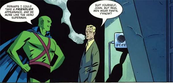 Cooke not only wrote The New Frontier, but illustrated it as well. The book, if you couldn’t already tell from the images above, is full of great imagery that brings the style of the Silver Age to life. His work on J’onn’s shape-shifting abilities, as well as his true form, are great to look at, such as the sequence where J’onn transforms into the form of many popular television icons. His depiction of Batman also captures his frightful appearance, but Cooke even makes that part of Batman’s evolution from his first costume to a more ‘acceptable’ one, saying he only wants to frighten criminals, not children.