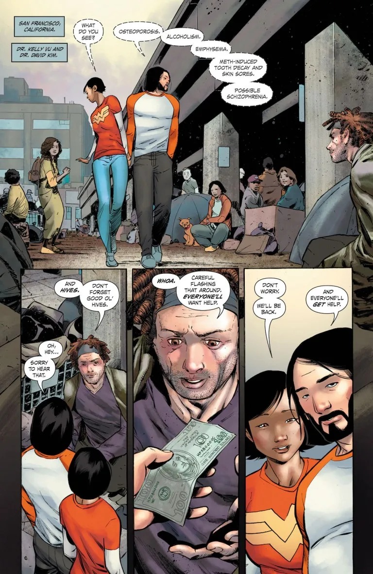 When Milestone returned, Reginald Hudlin and Denys Cowan weren’t planning to stop there! Now they welcome you to a whole new realm of original characters, extending far beyond Dakota…welcome to Earth-M! Nanotech engineers Dr. Kelly Vu and Dr. David Kim are committed to only one thing more than each other: using their regenerative nanobots to save the world. And following a violent attack, those very same nanobots end up saving David and Kelly’s lives…sort of. Their salvation comes with an unexpected consequence: husband and wife awaken to realize that they now share one super-powered body!