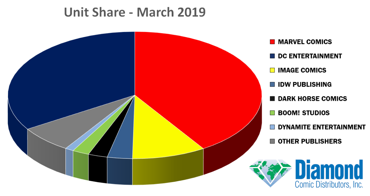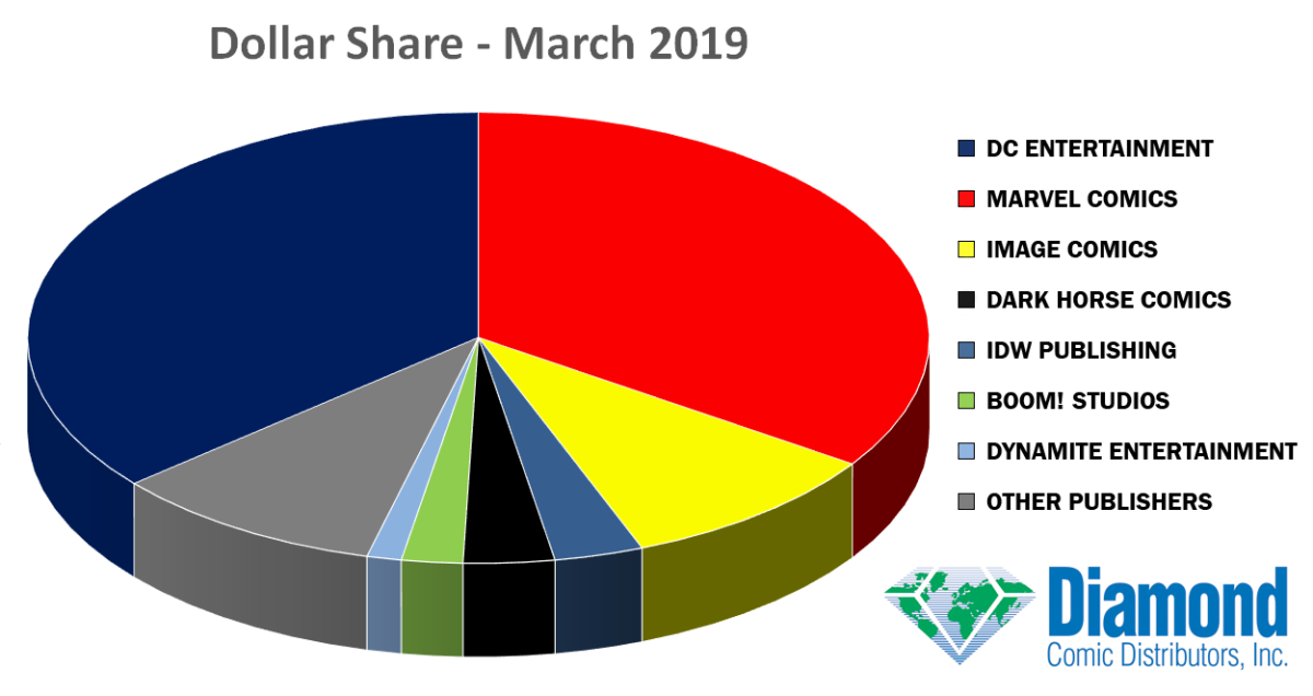 Thanks to the 80th anniversary celebrations for Batman, DC Entertainment has topped Diamond Comic Distributors comic book charts for March 2019. It’s the first month that Marvel has had to settle for second place since August 2016, and only the second time in six years that DC has found itself ahead of the competition in the monthly publisher charts.