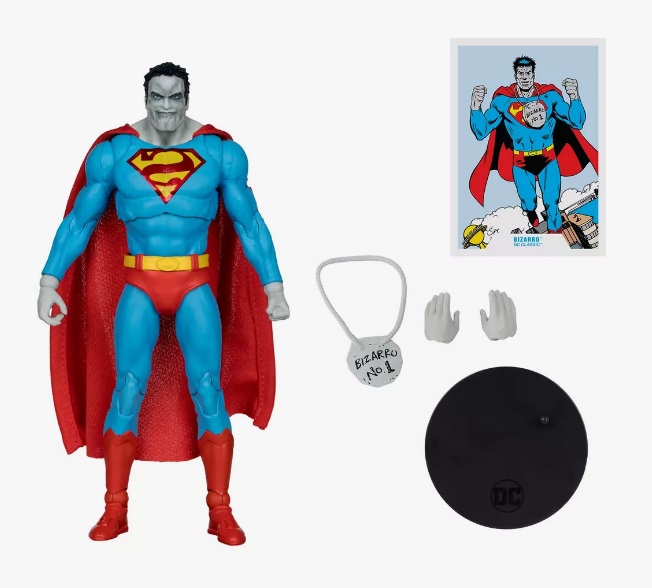 - Accessories include Bizarro necklace, 2 extra hands and base, Includes collectible art card with character art on the front, and character biography on the back