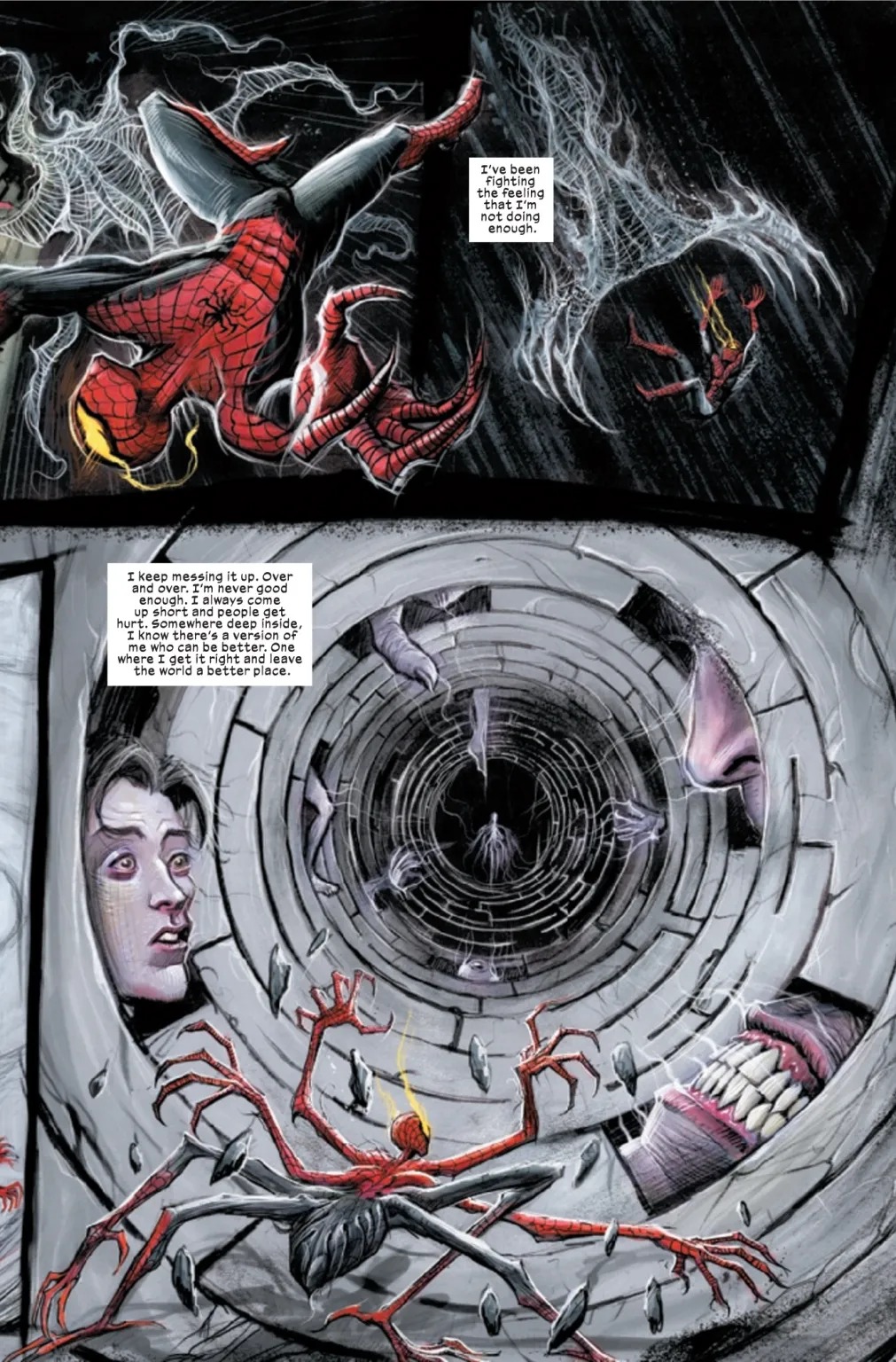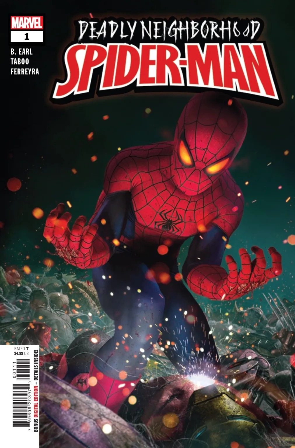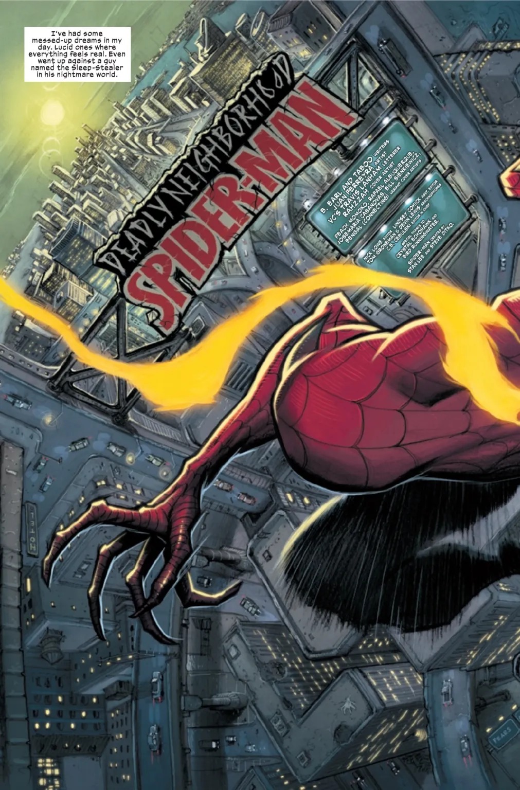 A revolutionary dark take on Spider-Man begins here! What is reality and what is dream? What is science and what is magic? At the intersection of all of this stands the Deadly Neighborhood Spider-Man. Peter Parker goes to Los Angeles and what he finds there are definitely not angels. The demons waiting for Peter are going to test him like never before. One demon in particular, a very famous one for Marvel and X-fans, might just eat Spider-Man alive.