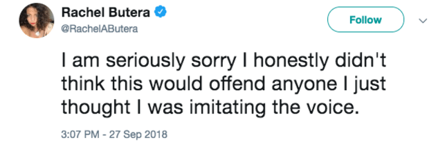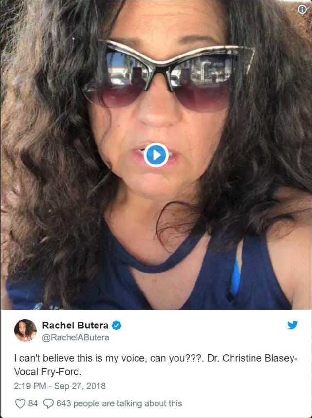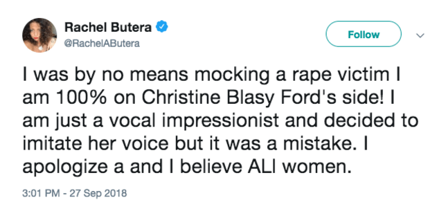 Butera, whose credits include The Adventures of Rocky and Bullwinkle and Family Guy, posted a video where she imitated the voice of Dr. Christine Blasey Ford, who had been giving testimony to the Senate Judiciary Committee about an alleged sexual assault by U.S. Supreme Court nominee Brett Kavanaugh.
