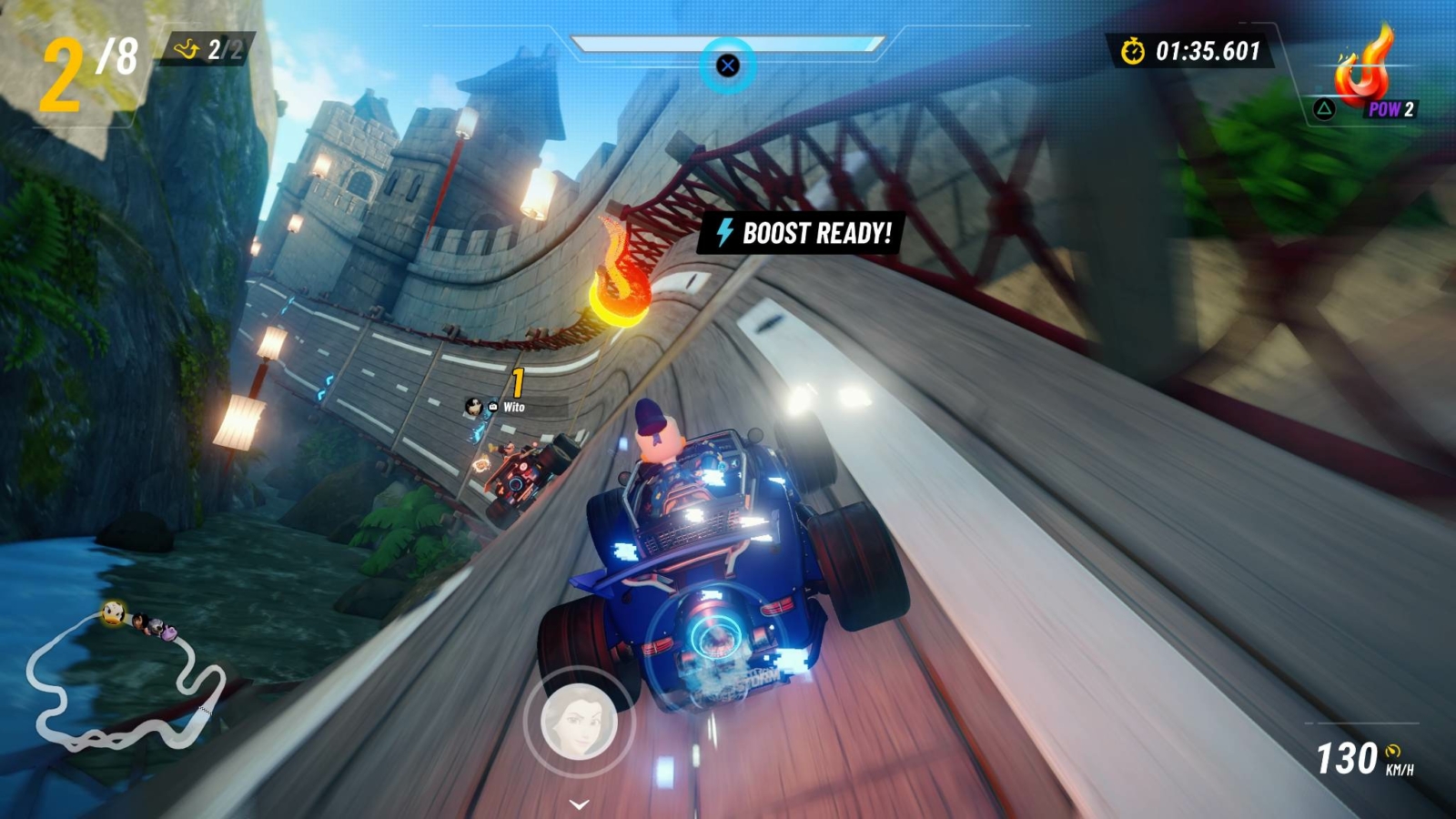 At the lesser end of the spectrum, you’ve got Mickey Mouse, who can trigger a brief period of invulnerability and acceleration for himself. However, there is a fatal drawback to this. Whenever the status is activated, Mickey will also inadvertently leave behind a slipstream that applies the exact same benefits to any rivals following in his wake. So, it’s a risk-reward situation that forces you to carefully judge when you want to use the ability and when you ought to hold off instead.