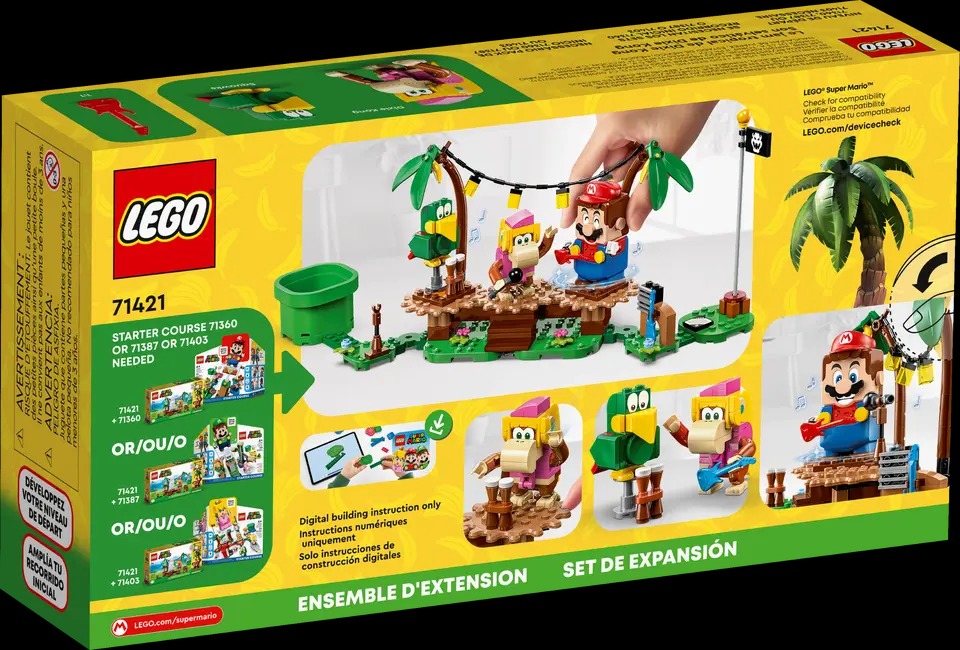 • 2 LEGO® Super Mario™ characters from the jungle home of Donkey Kong™ – Dixie Kong with a guitar element and Squawks the parrot with a buildable microphone, plus buildable bongos and an amplifier