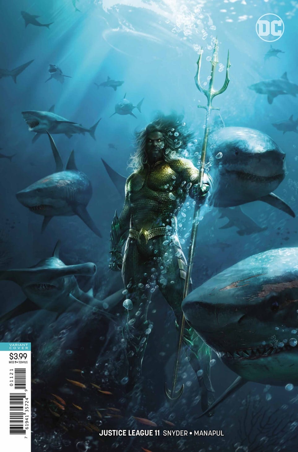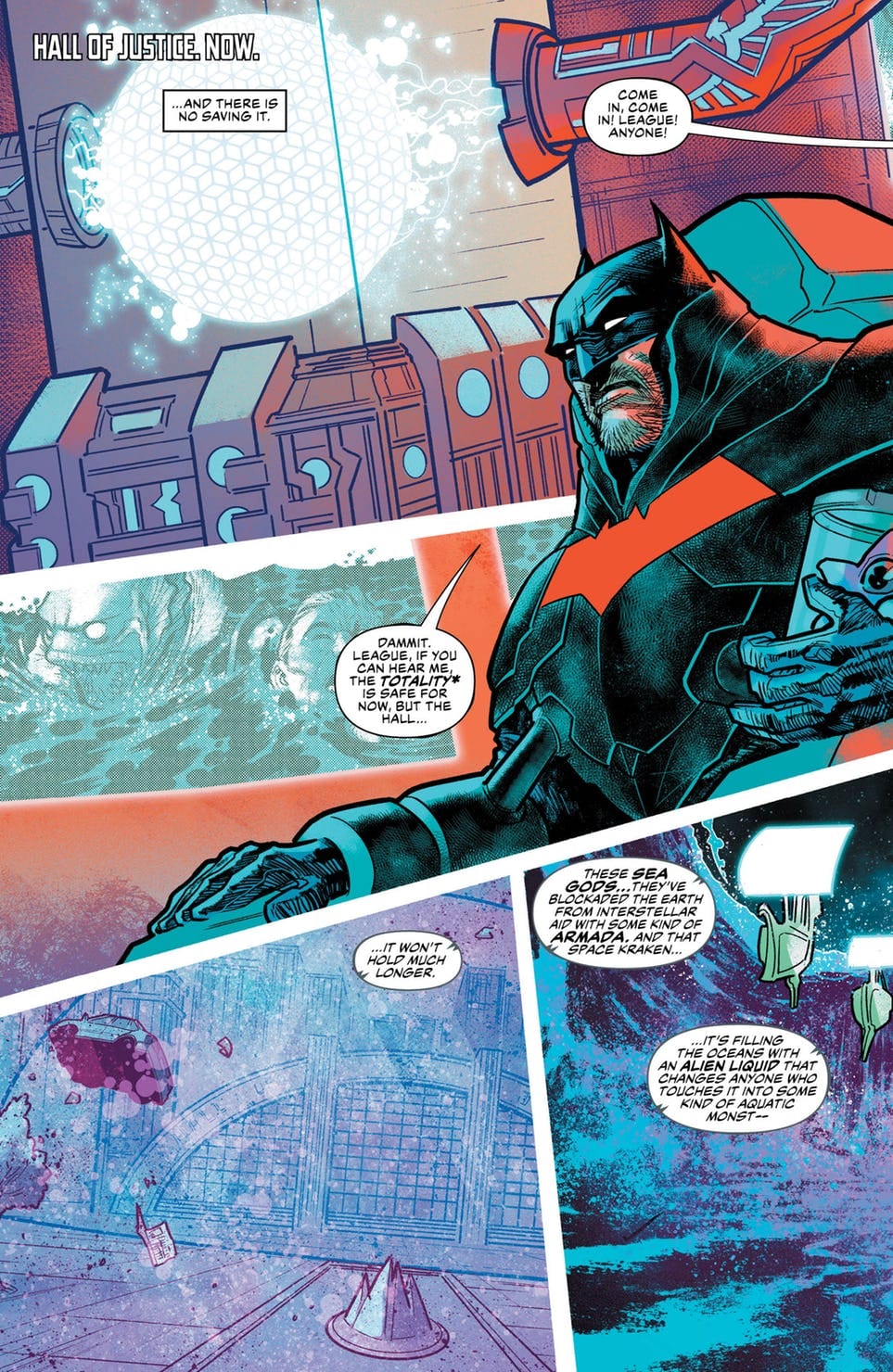 “DROWNED EARTH” part two! The Justice League is scattered across the Seven Seas, pursued by the Ocean Lords and their army of alien mercenaries and constantly at risk of turning into fish monsters. You know, just a day at the beach. Their only hope lies in the crippled Aquaman, who believes the road to victory lies in unleashing equally vengeful gods on Earth’s oceans. Meanwhile, Batman guards the Totality in the sunken Hall of Justice, where no one can attack him…or can they?