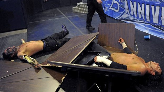 For fans of the Hardys in their Attitude Era heyday, it’s the first portion of this three-disc set that will boast the most excitement. It’s a near three-hour compendium of splintered tables, toppling ladders and crumpled chairs that escalates consistently. An early ladder match in which the Hardys take on Edge and Christian at No Mercy in 1999 features just two ladders, in stark contrast to the IKEA catalogue of weaponry deployed in the all-out war now known as TLC II from WrestleMania X-Seven – one of my favourite wrestling matches of all-time.