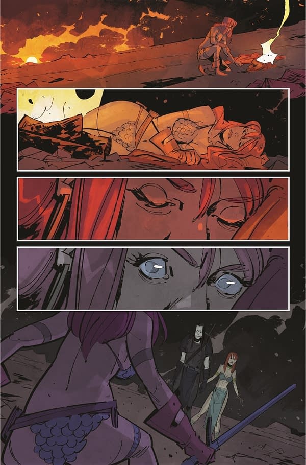 The fast-paced tale of mystery, suspense, and the supernatural finds Red Sonja tracking down a fabled gem from a crumbled, ancient kingdom. Along her adventure alone through a dangerous wasteland, she comes across a wayward prince and his fellow redheaded bride. The trio are afforded just a brief opportunity to get to know each other before they’re ambushed by a monstrous beast from below their very feet! And that’s just the beginning!