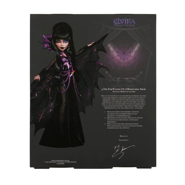 Monster High once again teams up with the Mistress of the Dark to conjure an unforgettable Skullector Elvira Doll. Elvira stuns in a black faux leather dress, shimmering batwing cape, and signature spooky sass. Equal parts goth and glam – her look dazzles even the darkest depths of the underworld. So, dim the lights and make yourself uncomfortable, because Elvira is putting on a performance that’ll raise the dead! Available exclusively at San Diego Comic-Con 2025.