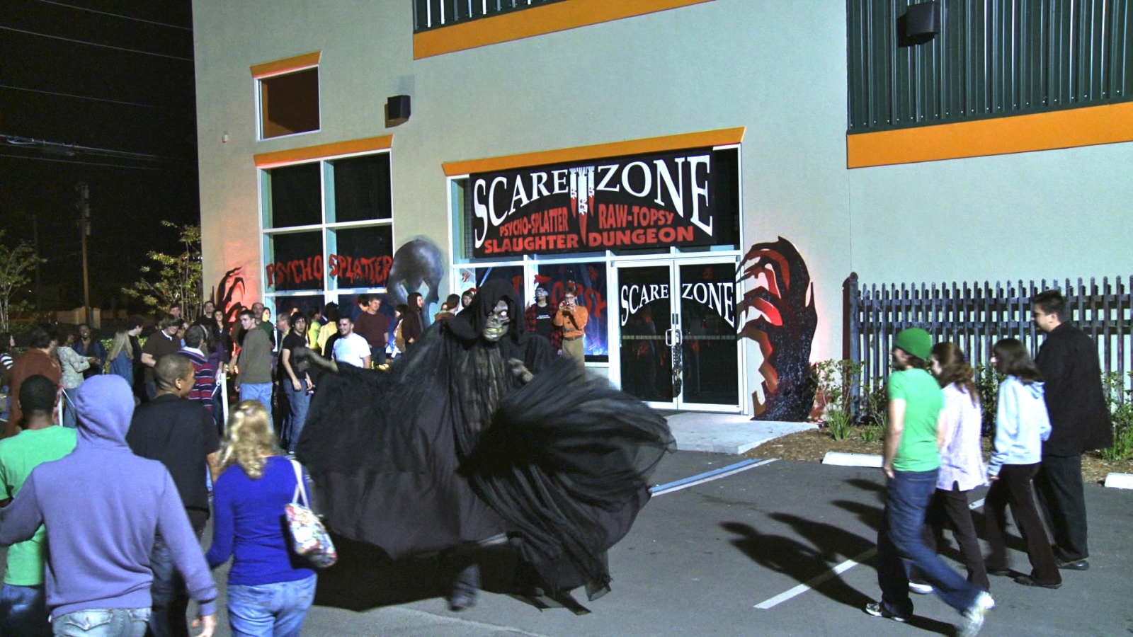 Welcome to Scare Zone, just another strip-mall Halloween Horror House …or is it? From the strobe room to the masked maniacs wielding chainsaws, knives and pitchforks as they chase paying customers through the halls of this haunted maze, it’s one good jump scare after another. However, as terrible things begin to happen and people end up dead, the visitors of Scare Zone think it’s all just part of the “show”!