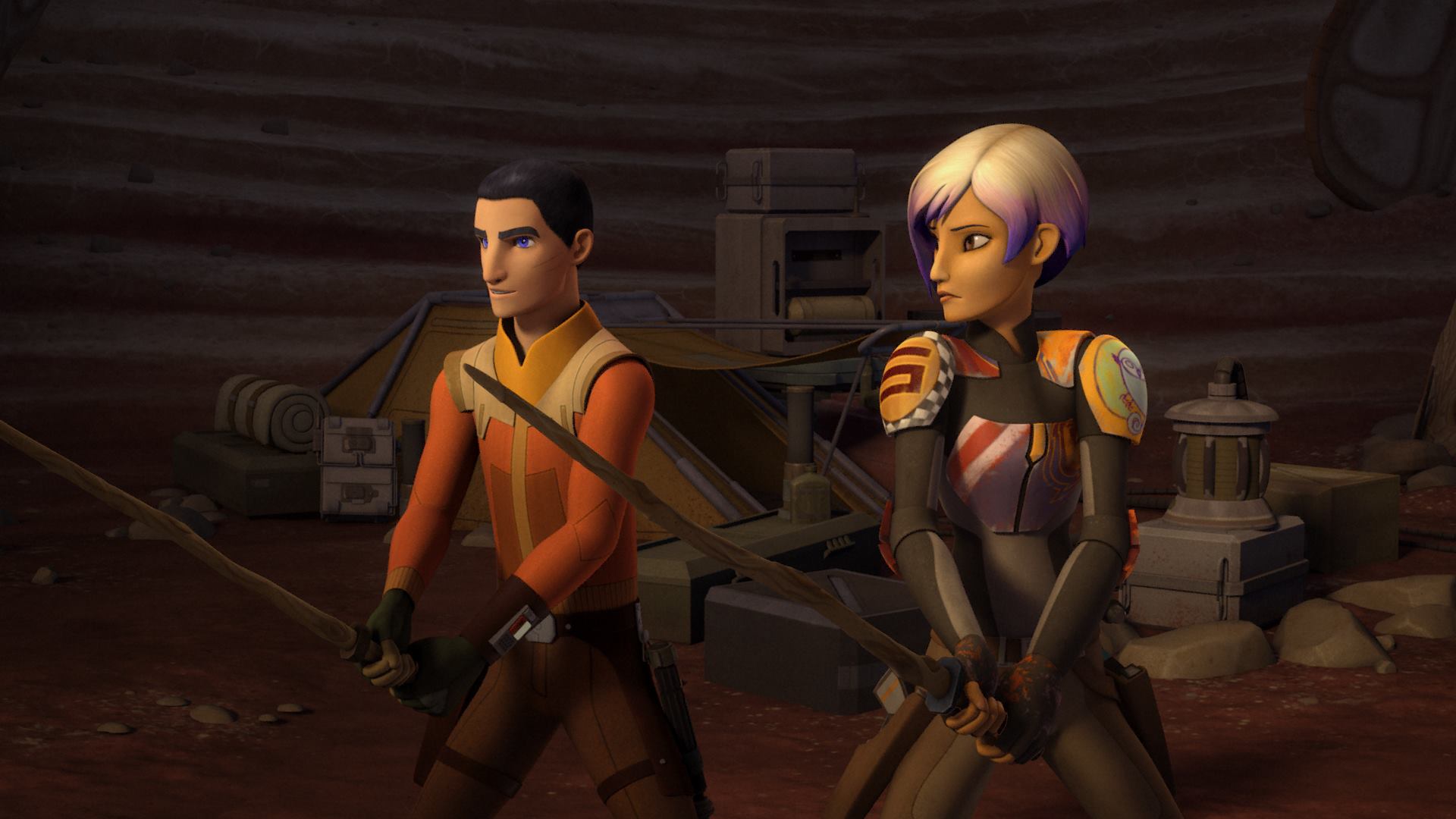 RC: You mentioned how Ezra comes in at the beginning and shakes things up. I found Ezra and Sabine’s relationship pretty interesting where it kind of started with this “will they/won’t they” trope, but it ended up becoming a brotherly/sisterly relationship, just sibling love between them, especially in their final moments where Sabine helps Ezra sneak out of the base to help save the day and then she decides to go out and search for him. Can you give us your own thoughts on how Sabine views Ezra and how you and Taylor accomplished their relationship?