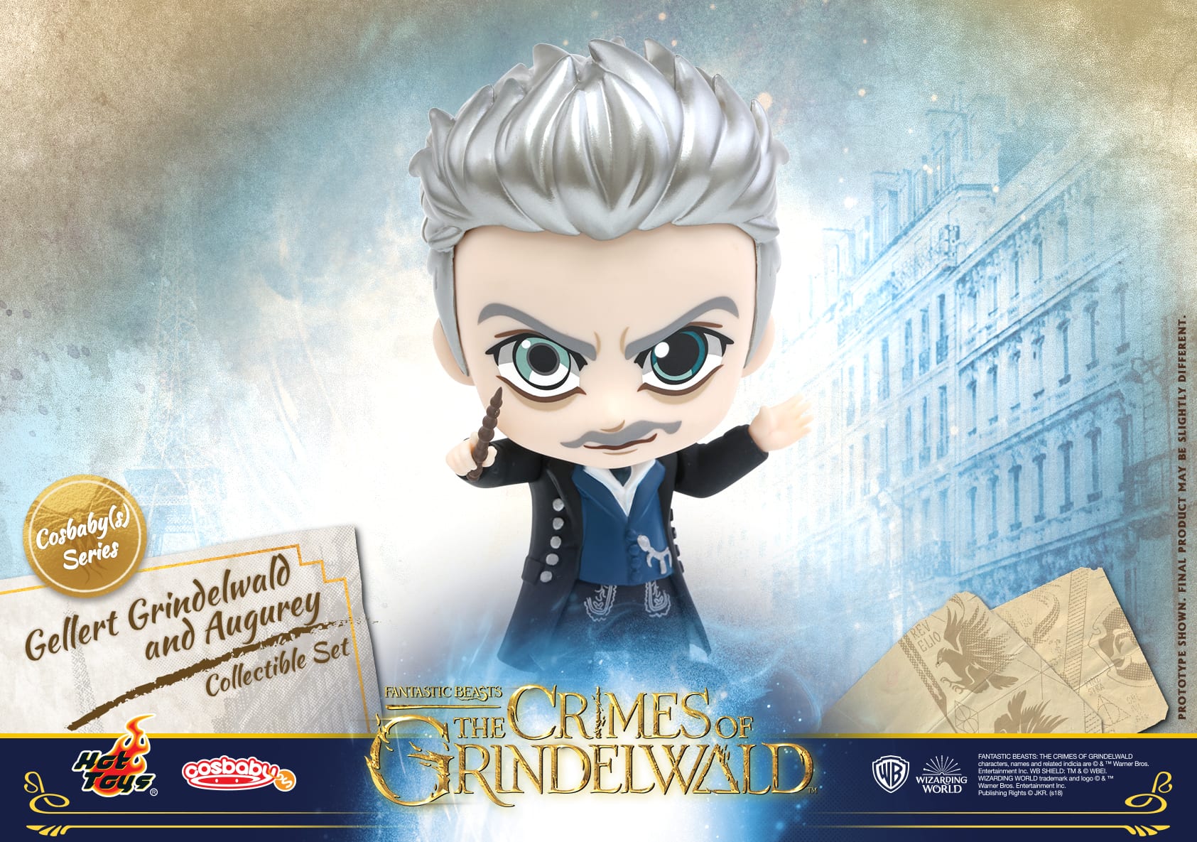 Gellert Grindelwald and Augurey Cosbaby (S) Collectible Set includes the dark wizard Gellert Grindelwald wields the Elder Wand in his on guard position ready for a battle and Augurey, a small bird with greenish black feathers and a sharp beak.