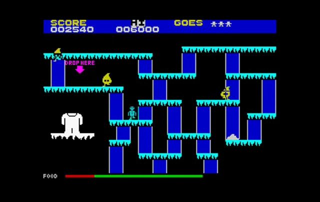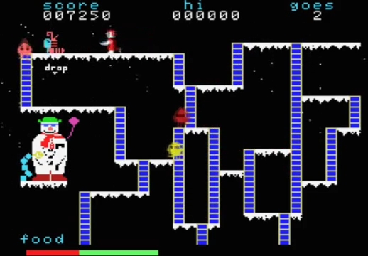 Running around collecting parts of the snowman while avoiding little flames who want to send you to sleep is SNOW joke. – Spectrum 48k