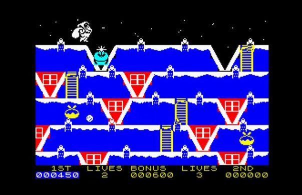 The Spectrum once again proved the victor in the computer wars as Speccy gamers didn’t have to put up with the tune to ‘We’re Walking in the Air’ like those with the C64 version thanks to not having as good sound. To be fair, the C64 did do it rather well but the real winner is the MSX which had lots of carols to keep you entertained while you played.