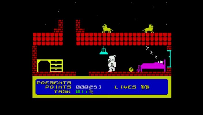 The final stage finds players having to navigate a house filled with sleepwalking kids in order to get the gift under the tree and once this is achieved get out the house again. Strangely enough he opts not to climb the chimney so instead must seek out the door key and leave through oddly placed doors.