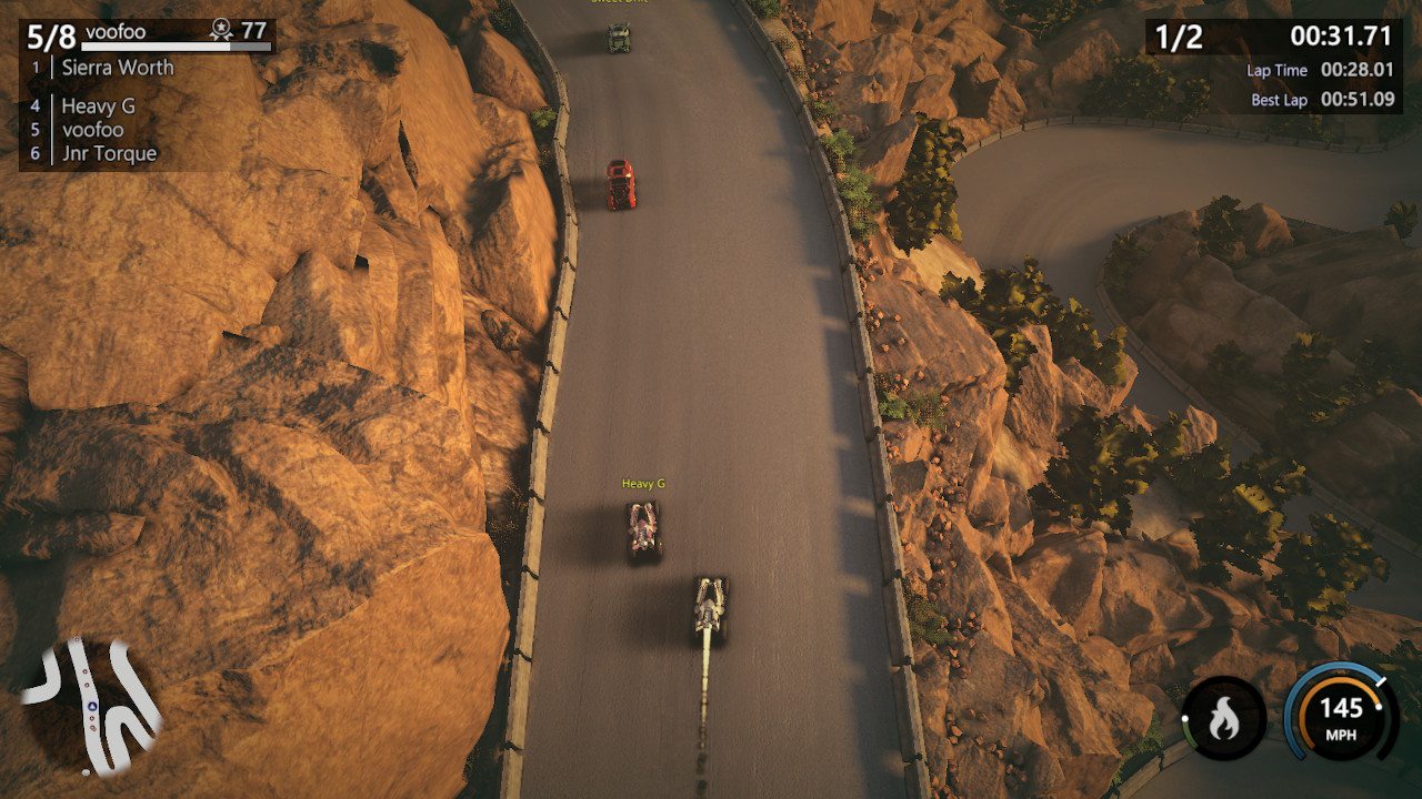 ‘Battle Cars’ were brought in due to popular demand: “The focus was to make Mantis Burn Racing a proper top down racer without any gimmicks,” Said Shaun Read, Creative Director, “but the idea of a battle mode was one of the main things fans were asking for, so we decided to put it in as an extension of the game, rather than dominating the top-down racer at its core.” Even with ‘Battle Cars’ sitting to sate your Mario Kart desires, it is a much more tactical brawler. There are no pick-ups scattered around the track (aside from repair pads), your on-board machine guns activate after the first checkpoint and overheat after long bursts. Mines come in to play after the first lap and you are given three to use per consecutive lap, so use them wisely. While this may not sound as enticing – the carnage is real, and is barrels of fun – even when you all end up in a Michael Bay situation!