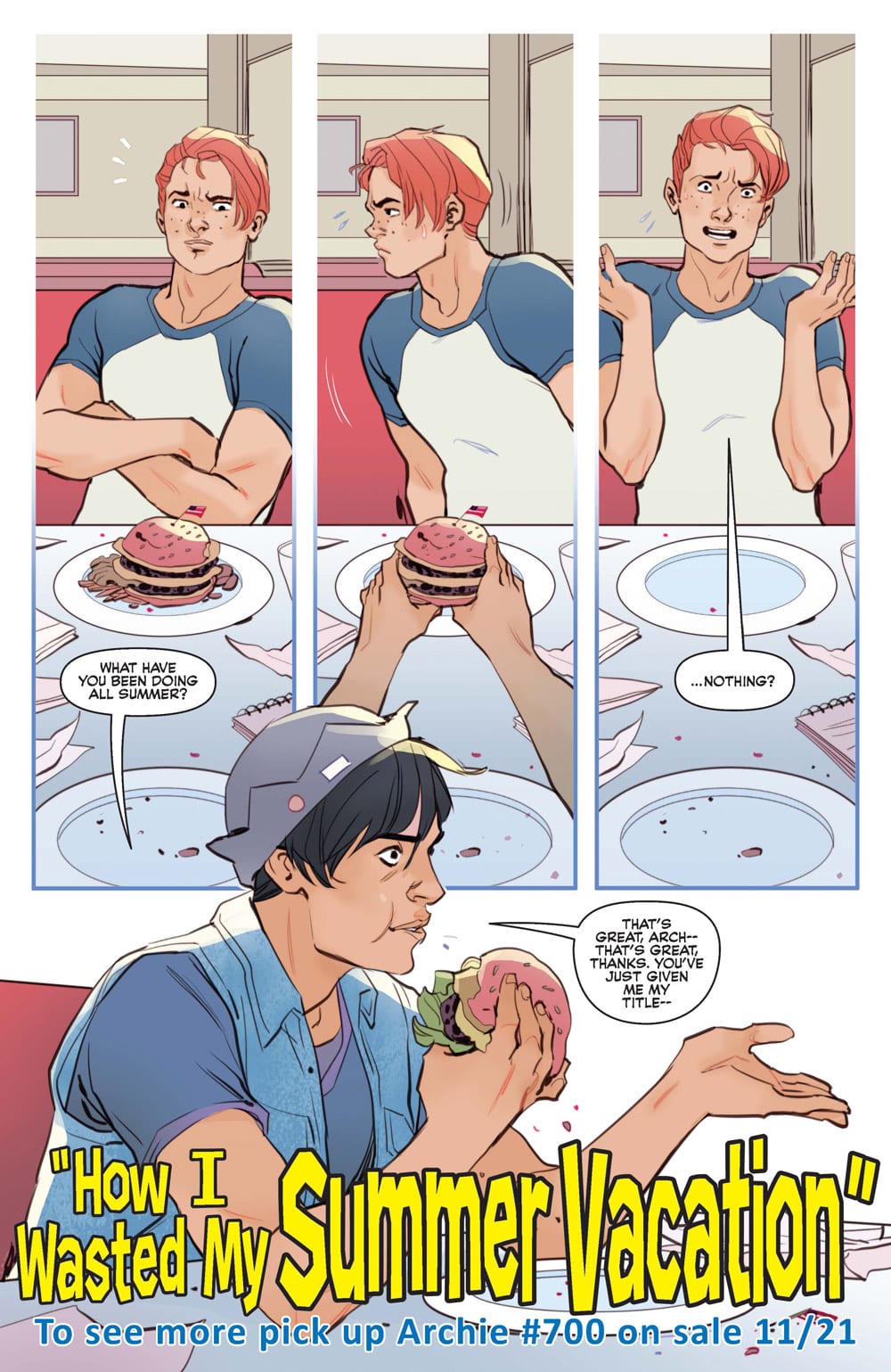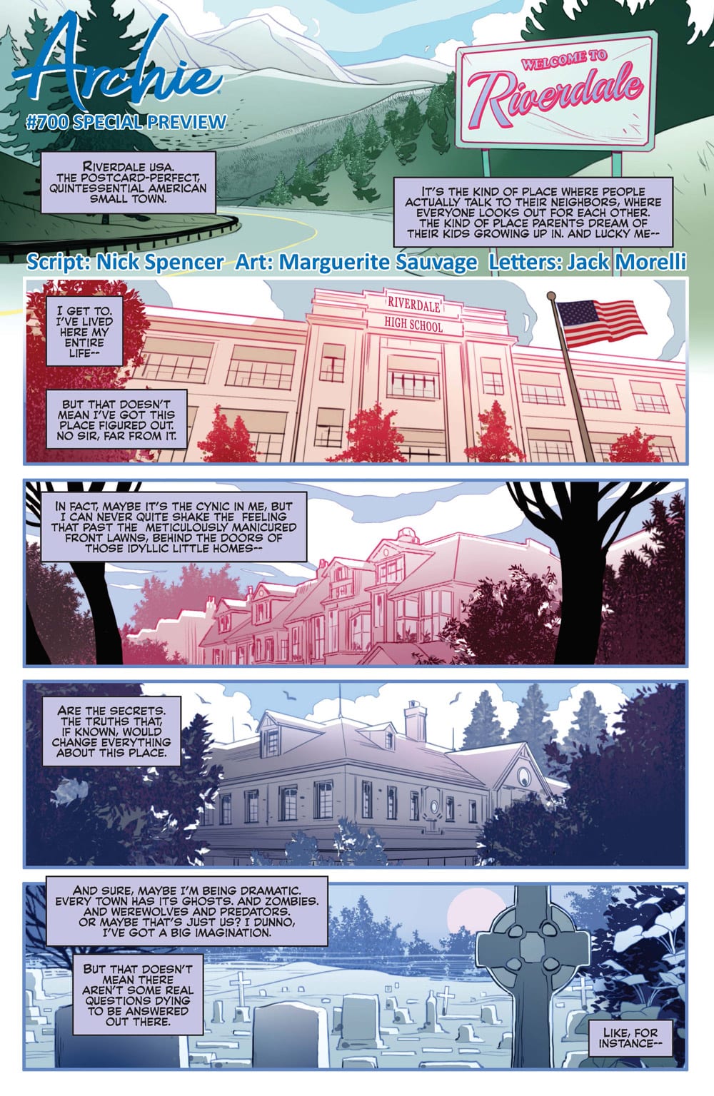 A brand-new era of ARCHIE begins in this landmark 700th issue of our flagship series! Join the new creative team of writer Nick Spencer (The Amazing Spider-Man) and artist Marguerite Sauvage (DC’s Bombshells) as they take a trip to Riverdale and bring Archie, Betty & Veronica, Jughead, and the rest of the town along for a wild ride complete with new mysteries, new relationships, and much more!