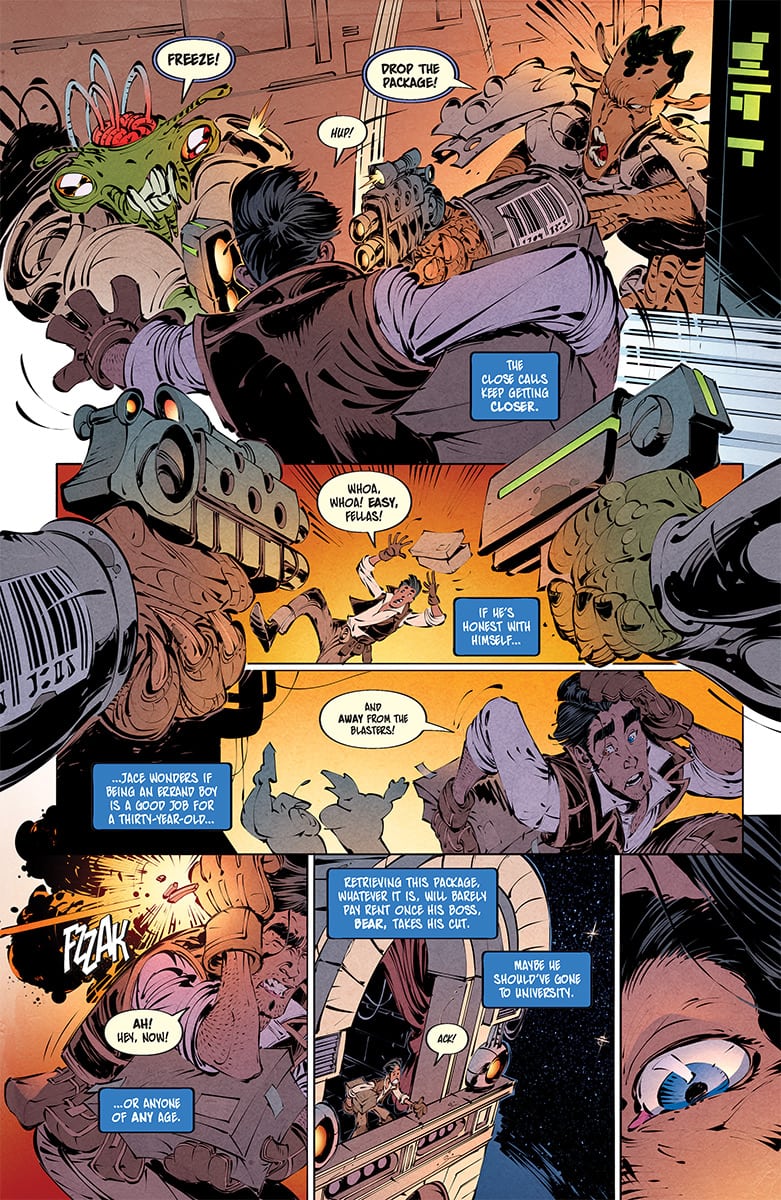 In the future, if you can’t find a decent job, you run errands—the dangerous, often illegal kind. In ERRAND BOYS, readers met 30-year-old Jace Lopaz is a hard-worn scoundrel and a lifelong solo act—until he’s saddled with his 13-year-old half-brother Tawnk full-time. Now Jace has two mouths to feed while evading the law, running from aliens, and jumping off skyscrapers. The only thing weirder than the vastness of space is family.