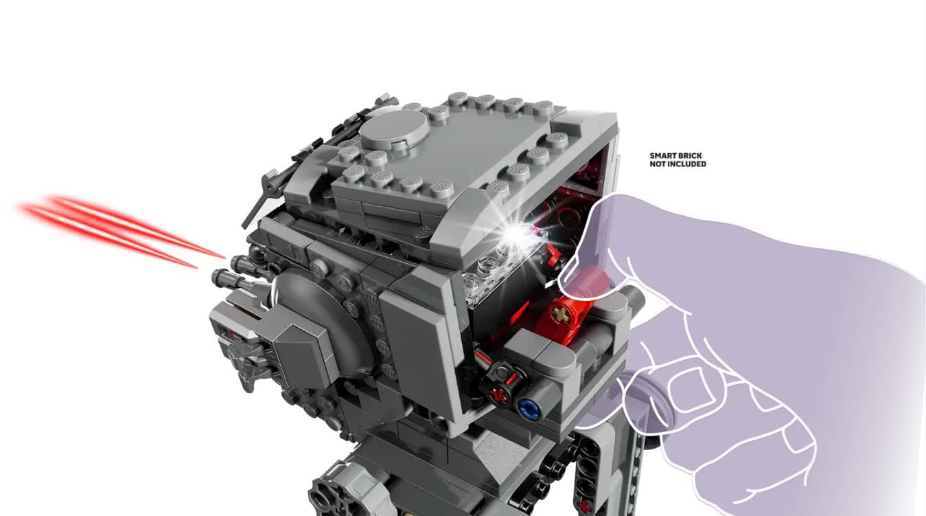 - 2 VEHICLES – Place the AT-ST Driver in the AT-ST walker’s cockpit, swivel the head of the AT-ST and fire its dual stud shooter and flick shooter at the speeder bike hijacked by SMART Wicket