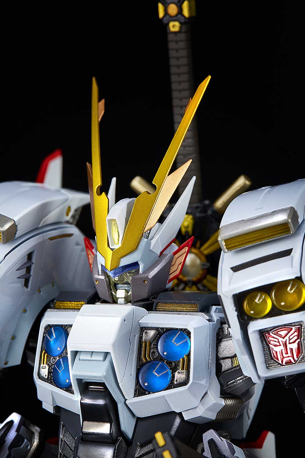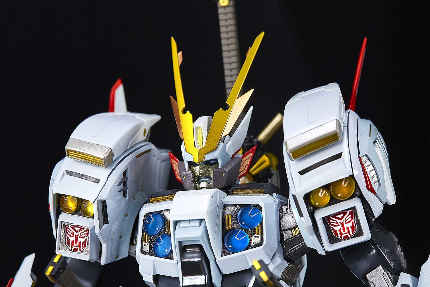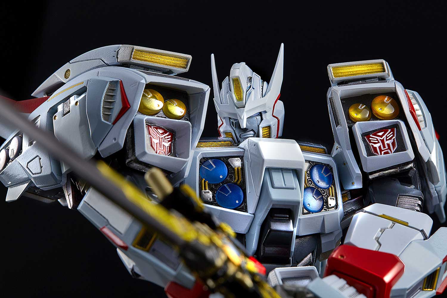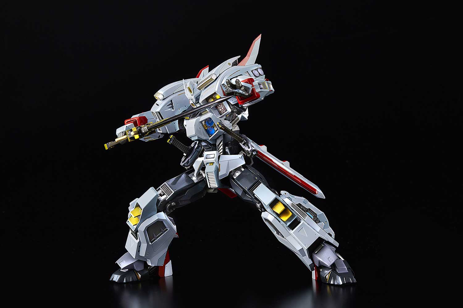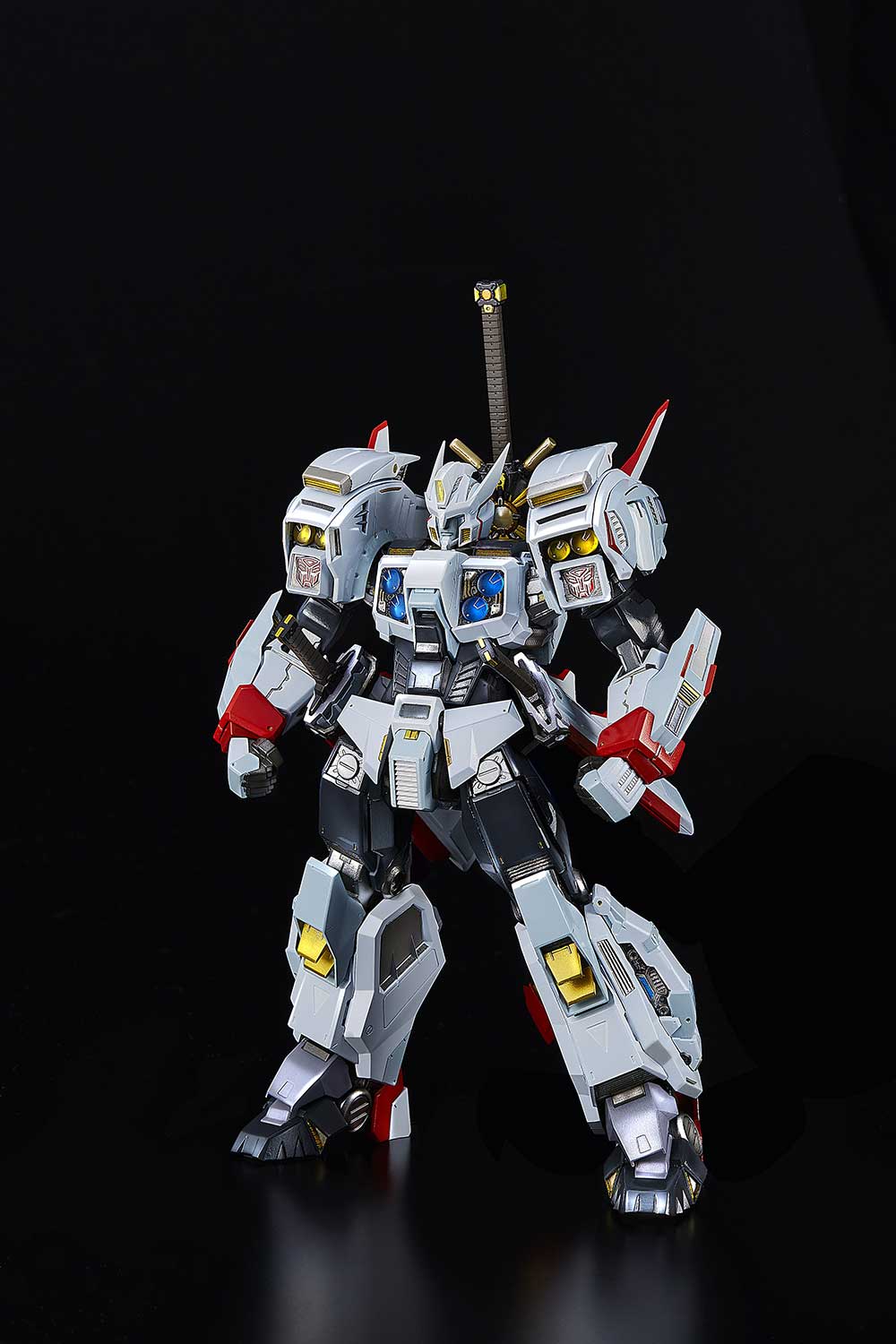 The (non-transforming) Drift figure also features 3 interchangeable facial expressions and contains 6 LED units that provide light-up displays on its body. The figure includes 3 sword weapons and a cape that is accented with bendable wires that allow for dramatic, anime-style windswept poses.
