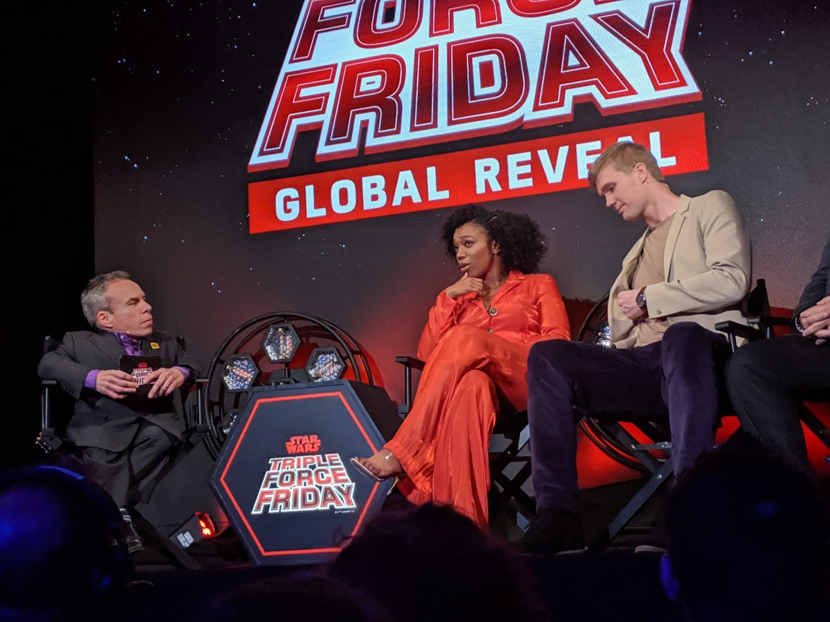 Before the official live-stream started, host Warwick Davis introduced The Rise of Skywalker stars Naomi Ackie and Joonas Suotamo to the stage for a Q&A, where the actors spoke briefly about their roles in Episode IX, as well as their excitement about being part of the Star Wars universe. Also part of the panel were Tasia Filippatos of Disney Consumer Products and Chris Gollaher of Lucasfilm’s Global Product Development, who shared some insights into the Star Wars merchandising machine and all of the goodies fans could expect to get their hands on this Force Friday.