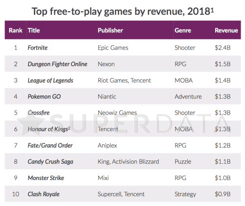 Total digital video game revenue reached $87.7 billion in 2018, compared to $17.9 billion from physical releases. Of that $87.7 billion, 80% was spent on free-to-play games, with the top ten as follows:
