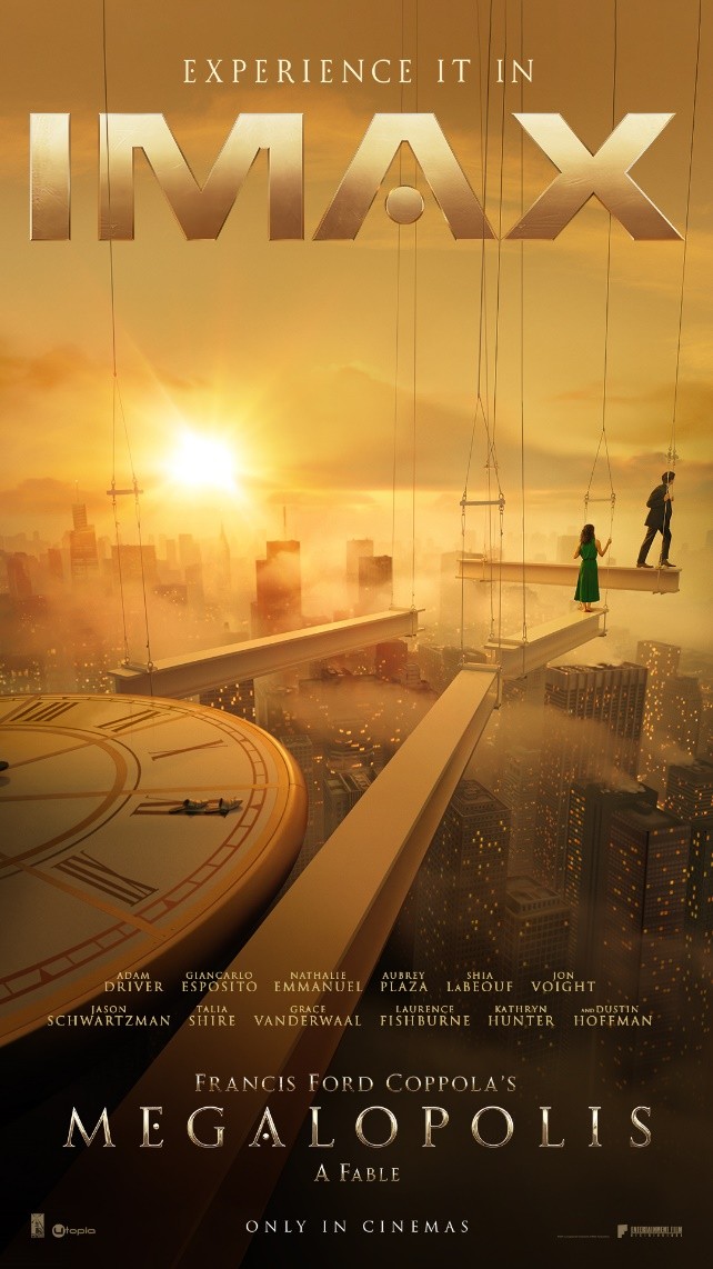 Lionsgate has shared a new, made-up critic quotes-free trailer and IMAX poster for Francis Ford Coppola’s star-studded sci-fi drama Megalopolis which tells the story of the conflict between a genius architect (Adam Driver) and a corrupt Mayor (Giancarlo Esposito) as they look to rebuild the city of New Rome.