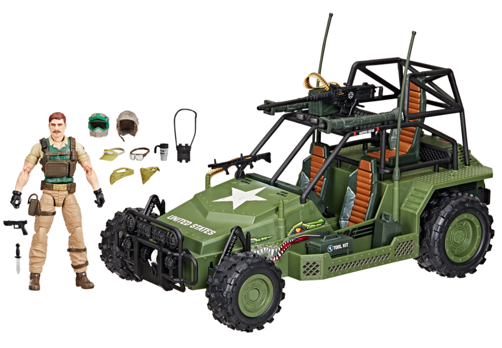 New to the G.I. Joe Classified Series line, Crankcase & A.W.E. (All-Weather And Environment) Striker come ready for adventure, with multiple points of articulation for high poseability. This Crankcase figure contains 9 accessory pieces including 2 helmets, visor, knife, binoculars, goggles, bandana mask, scarf, and weapon accessories. Awe Striker includes functioning tires and suspension, removable roll cages and third bucket seat, tow hitch, tool kit, 2 ammo boxes, antennae, gas can, coffee mug, sticker sheet, and weapon accessories. The interior features articulated steering wheel, gear shifter, and power brake; plus cup holder, Radio System handset, and dashboard detail.