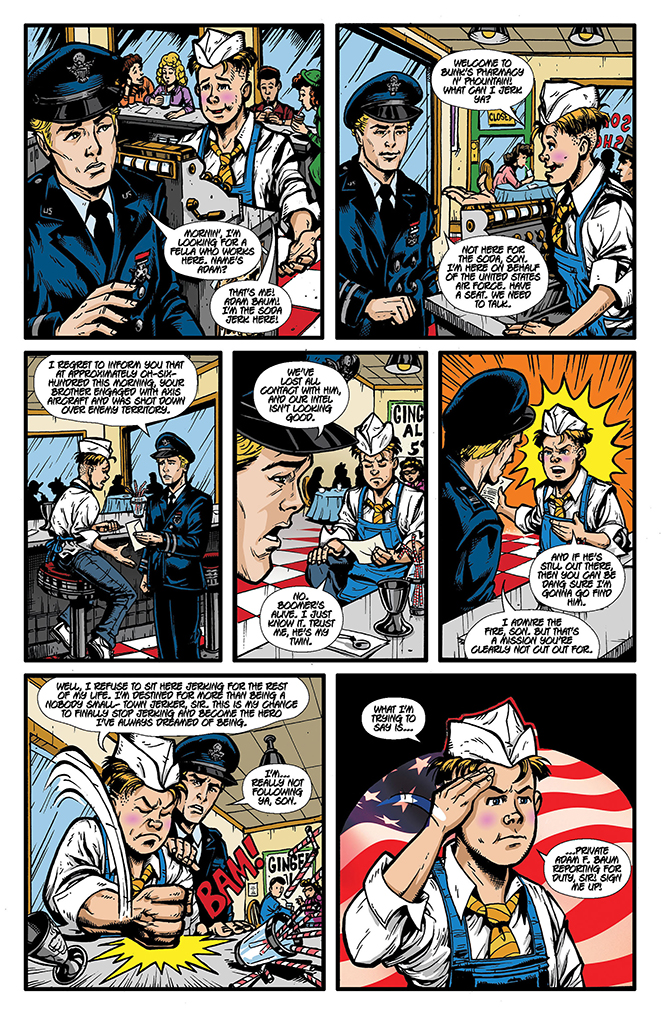 Issue #1 starts with Adam Bomb’s origin and how he begins as an unassuming, flat-footed soda jerk named Adam Baum…ultimately transforming into an All-American superhero named Adam Bomb. Thanks to an unfortunate radiation leak, Adam leads a team of other enhanced super-charged garbage humans to take down the axis of evil…led by Nasty Nick.