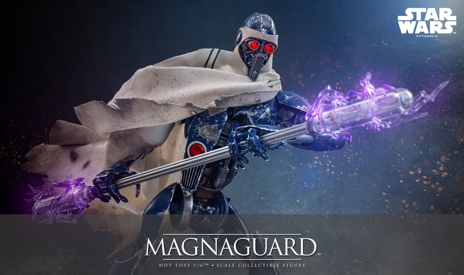 The MagnaGuard comes outfitted in a beige cloak with green stripes, battle-damaged details, and realistic weathering effects, faithfully capturing its frontline combat appearance. Equipped with its signature electrostaff, collectors can also attach the translucent purple lightning effect accessory to recreate its charged, deadly strikes. To complete the display, a specially designed figure stand with the Star Wars logo and character nameplate is included.