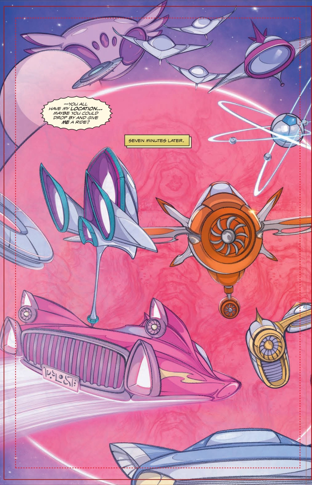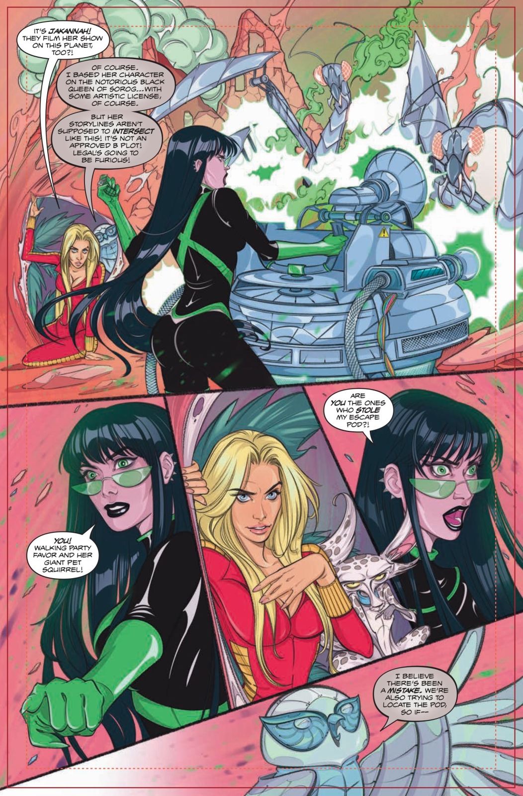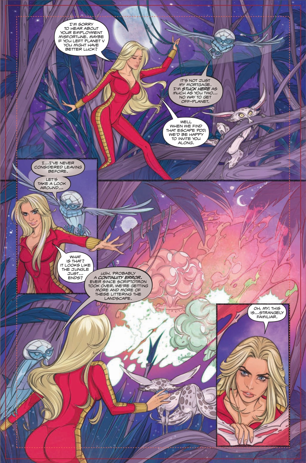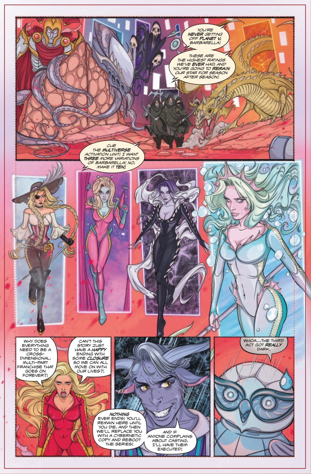 With her ship blown to pieces and the entire galaxy watching, Barbarella, Vix, and their unlikely new ally frantically search for a way off the perilous Planet V. But now that she’s the unwitting star of her own show, the deranged programming Director won’t let her go without a fight. Meanwhile, an old ally returns with a matter of grave concern.