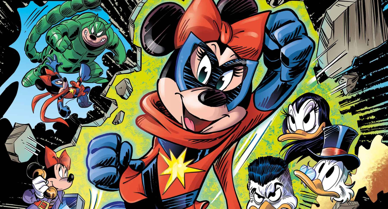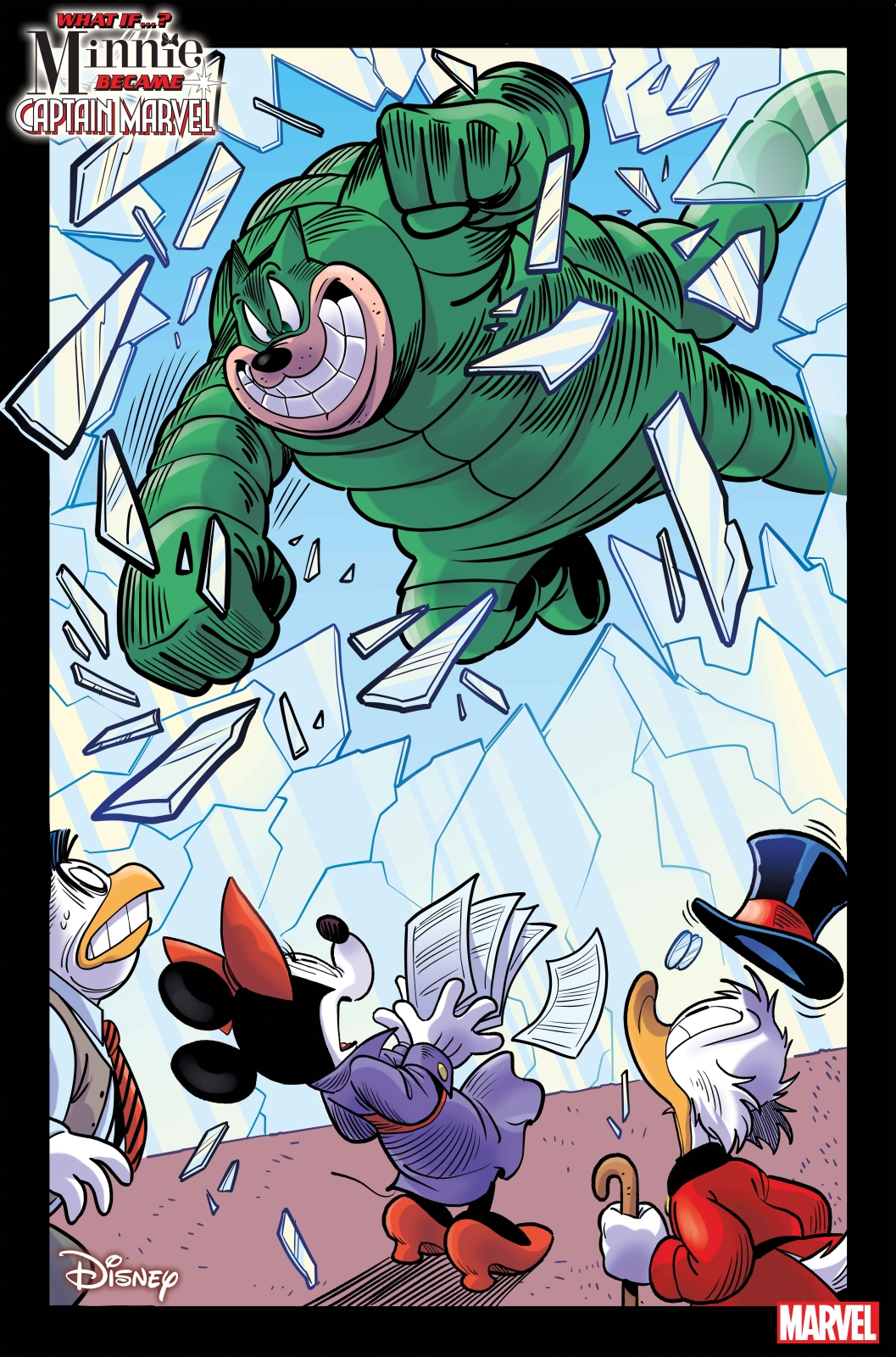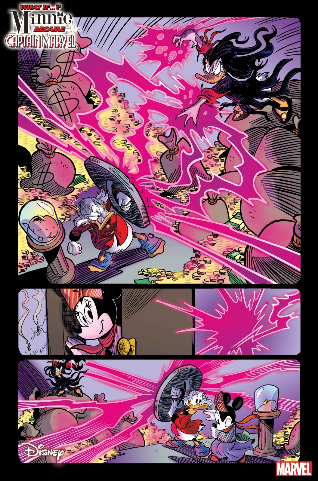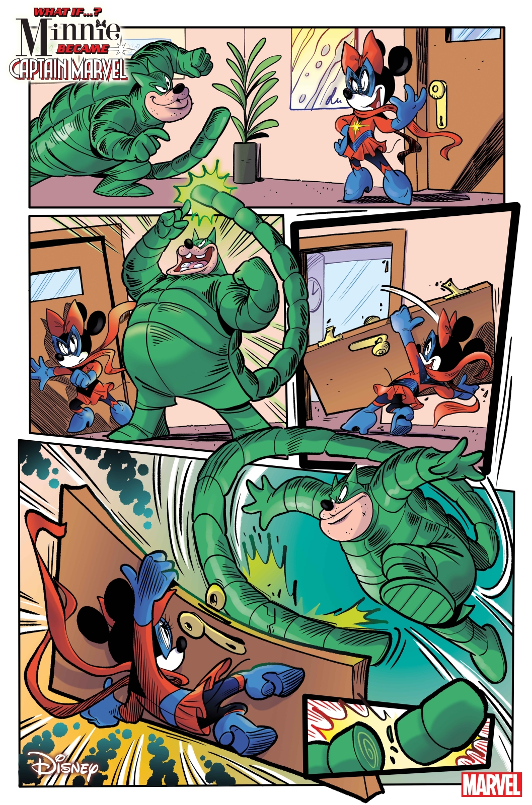 Inspired by MS. MARVEL VOL. 1 #1-4, our story finds The Chronicle newspaper reporter MINNIE MOUSE tasked with an exposé on a new hero on the scene in Duckburg, CAPTAIN MARVEL! But PEG LEG PETE – SCORPION complicates her plans with an attack on the Chronicle building! To make matters worse, JOHN D. ROCKERDUCK and the BEAGLE BOYS attack SCROOGE McDUCK’S money bin, and when Captain Marvel shows up to stop them, Minnie discovers an incredible secret about her past! What is Minnie’s connection to Duckburg’s sensational new hero, Captain Marvel?