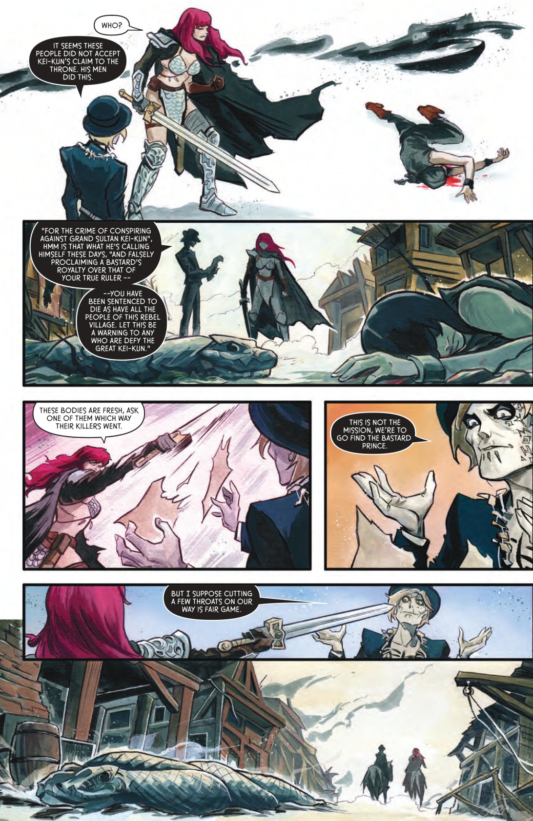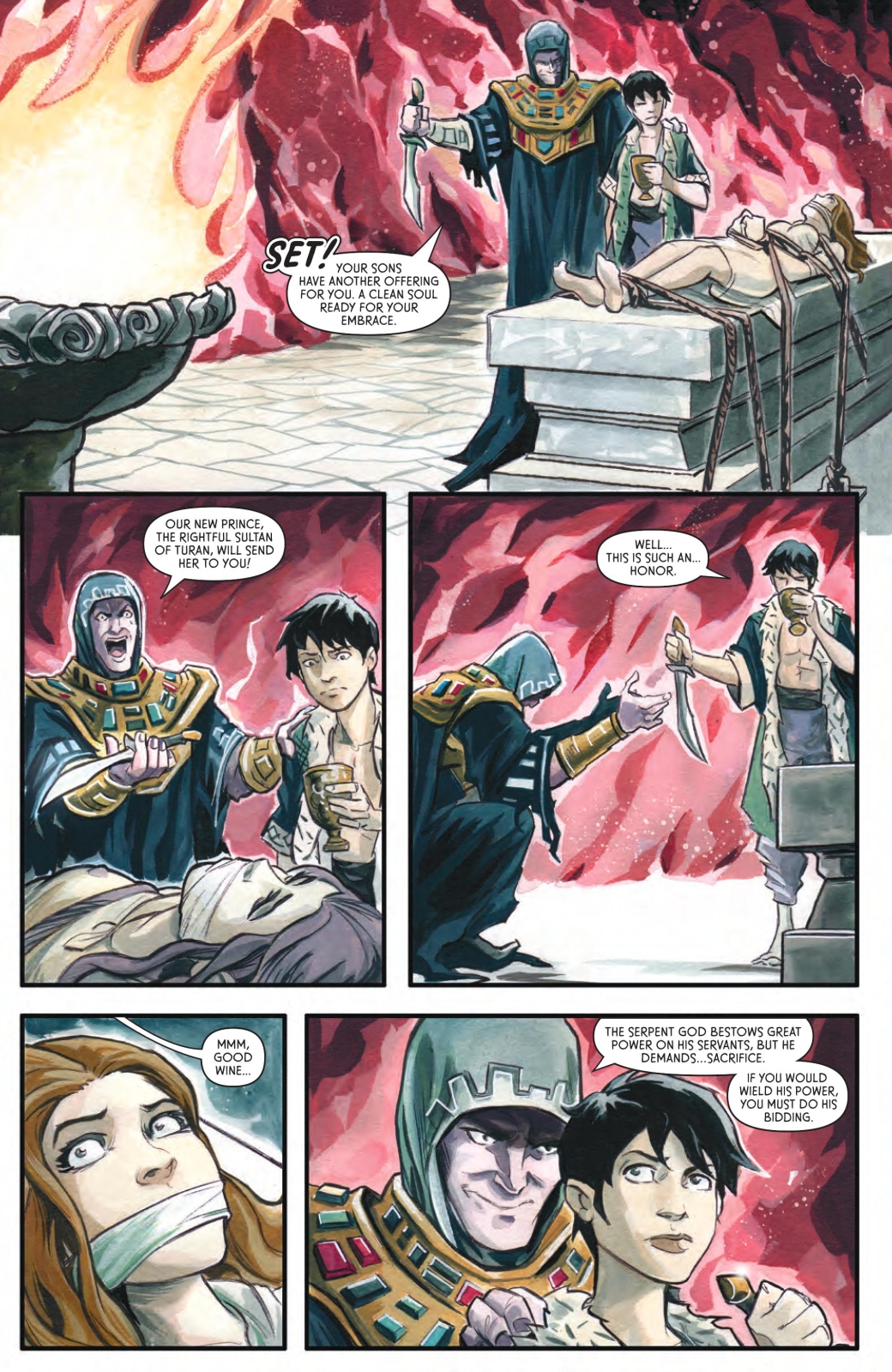 After interrupting a sacrifice to the serpent god Set and interrogating one of its recalcitrant priests, Sonja is one step closer to finding the late Sultan of Turan’s last surviving offspring, Ashim – the key to the She-Devil’s plan to staunch the chaos that her regicide inadvertently unleashed across the kingdom.