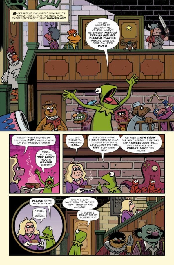IT WAS A DARK AND FROGGY EVENING! It’s time to cue the music; it’s time to dim the lights! It’s time to get things started as the Muppets return tonight! The show is about to begin at the famous Muppet Theatre, and the regular pre-curtain chaos has the troupe’s stalwart MC, Kermit the Frog, coming apart at the seams.