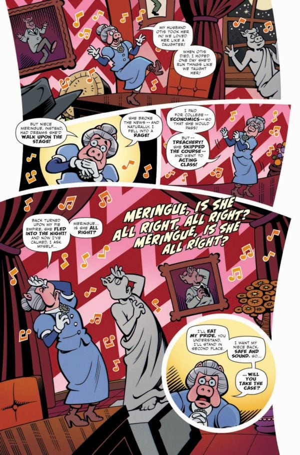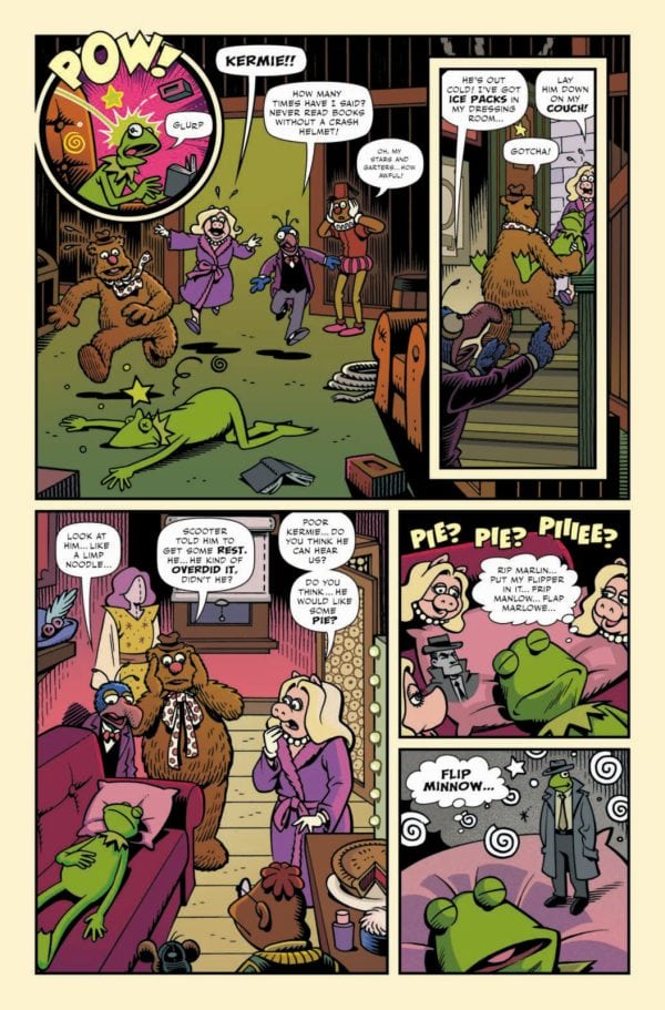 In an attempt to de-stress, he settles down to read a few pages of a favourite old detective novel only to get kayoed by an errant brick to the bean, leaving him laid out backstage as his co-stars try to coax him back to consciousness. But unbeknownst to them, Kermit has taken up the hard-boiled mantle of his fictional hero to walk the darkened streets of Dreamland, righting wrongs and cracking cases under the concealing cover of night.
