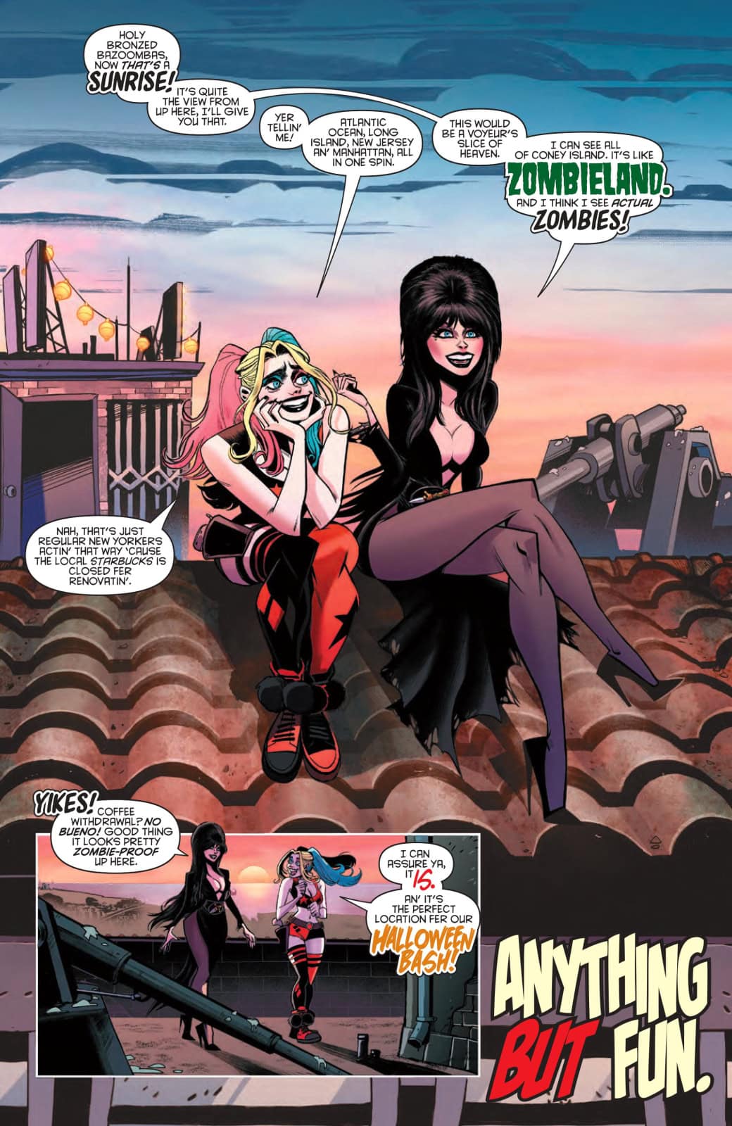 Putting together the biggest Halloween block party ever staged is a great idea in theory, but pulling it off means raising a massive amount of money — and a pile of cash that big is sure to draw the attention of every thug and delinquent in the Tri-State area. If Harley and Elvira want to keep their party funds secure, they’re going to have to become too big to fail — and that means going international!