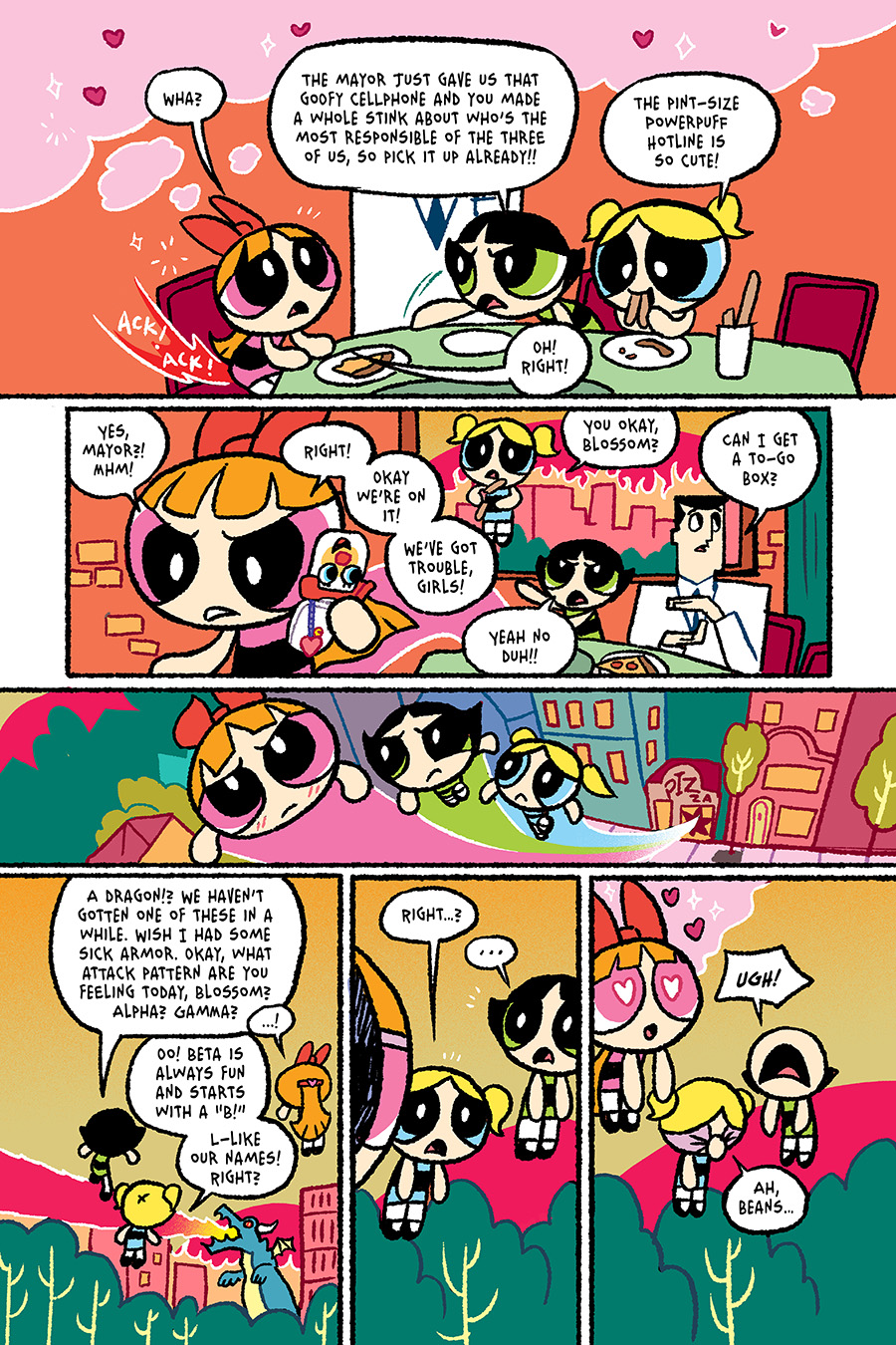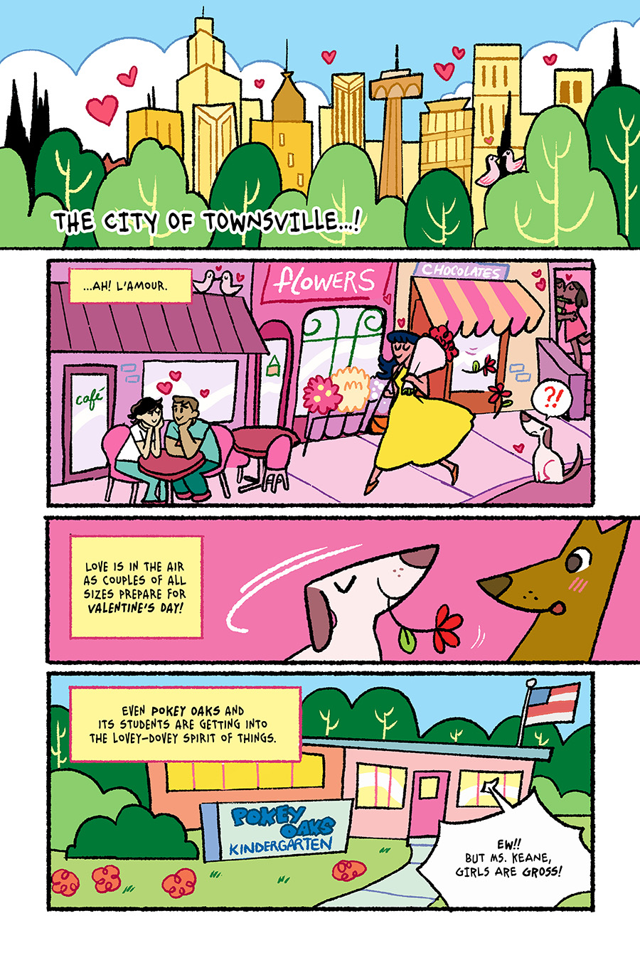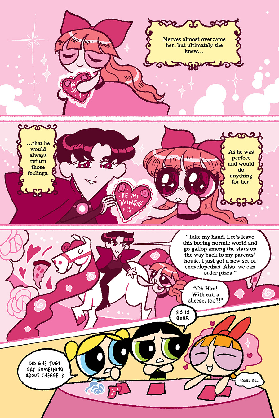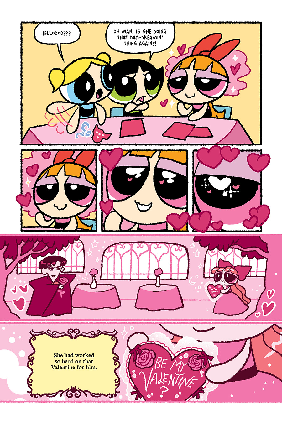 Dynamite Entertainment has shared a first-look preview of next month’s 40-page one-shot comic The Powerpuff Girls Valentine’s Mwah Mwah Kissy Face Special, which finds Blossom caught up with a V-Day crush, but will Buttercup and Blossom be able to shake her into shape enough to save the city from its latest dastardly attackers?