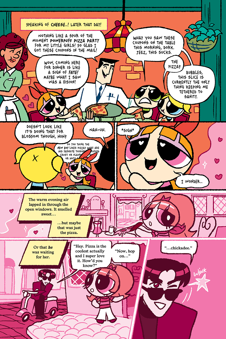 Suddenly, every scenario she encounters — from going out for pizza to clobbering giant monsters — is an occasion for a swooning flight of fancy. Even Mojo Jojo’s villainous schemes transform into fairy tale adventures through her newly heart-shaped eyeballs! Can Buttercup and Bubbles bring her back down to Earth in time to save the city from its inevitable attackers? Or will the Titans of Townsville succumb to the ultimate weapon — Cupid’s arrow?