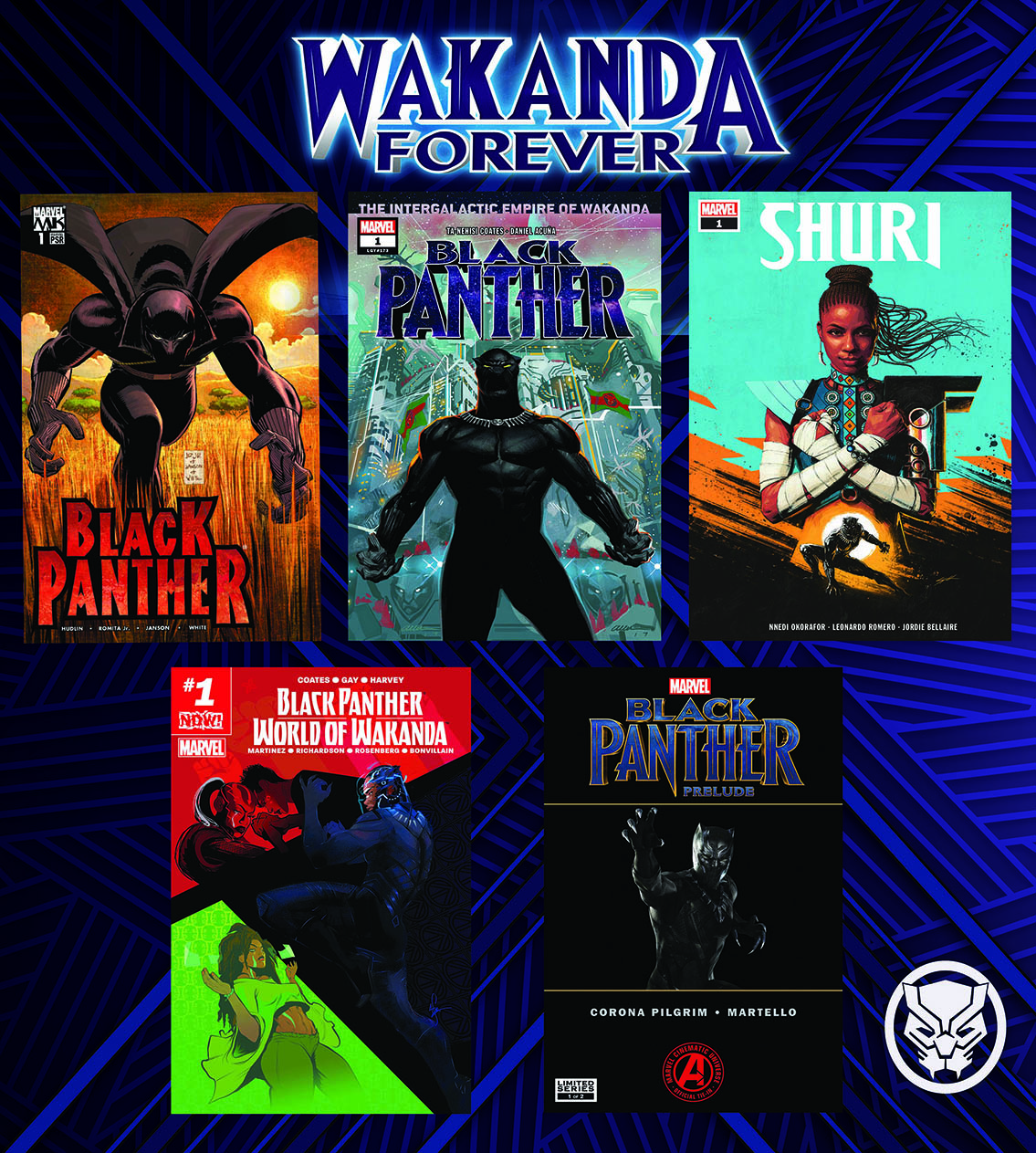 For a limited time, fans can relive some of the most iconic and thrilling Black Panther stories from Marvel’s most acclaimed creators, including Ta-Nehisi Coates, Nnedi Okorafor, Roxane Gay, Yona Harvey, Reginald Hudlin, John Romita Jr., and more, with Shuri #1, Black Panther #1 (2018), Marvel’s Black Panther Prelude #1, Black Panther #1 (2005) and Black Panther: World of Wakanda #1.