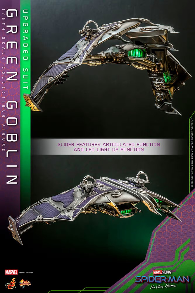 Expertly crafted based on Norman Osborn/ Green Goblin’s maniacal portrait in Spider-Man: No Way Home, the movie-accurate figure features a newly developed head sculpt of Willem Dafoe as Norman Osborn with separate rolling eyeballs, realistic wrinkles, and hair sculpture. His upgraded costume painted in metallic green color with battle-damaged effects, a distressed poncho, highly-detailed accessories including goggles, pumpkin bombs, attachable blades, his trademark Goblin Glider in one-sixth scale with LED light-up design and articulated function.