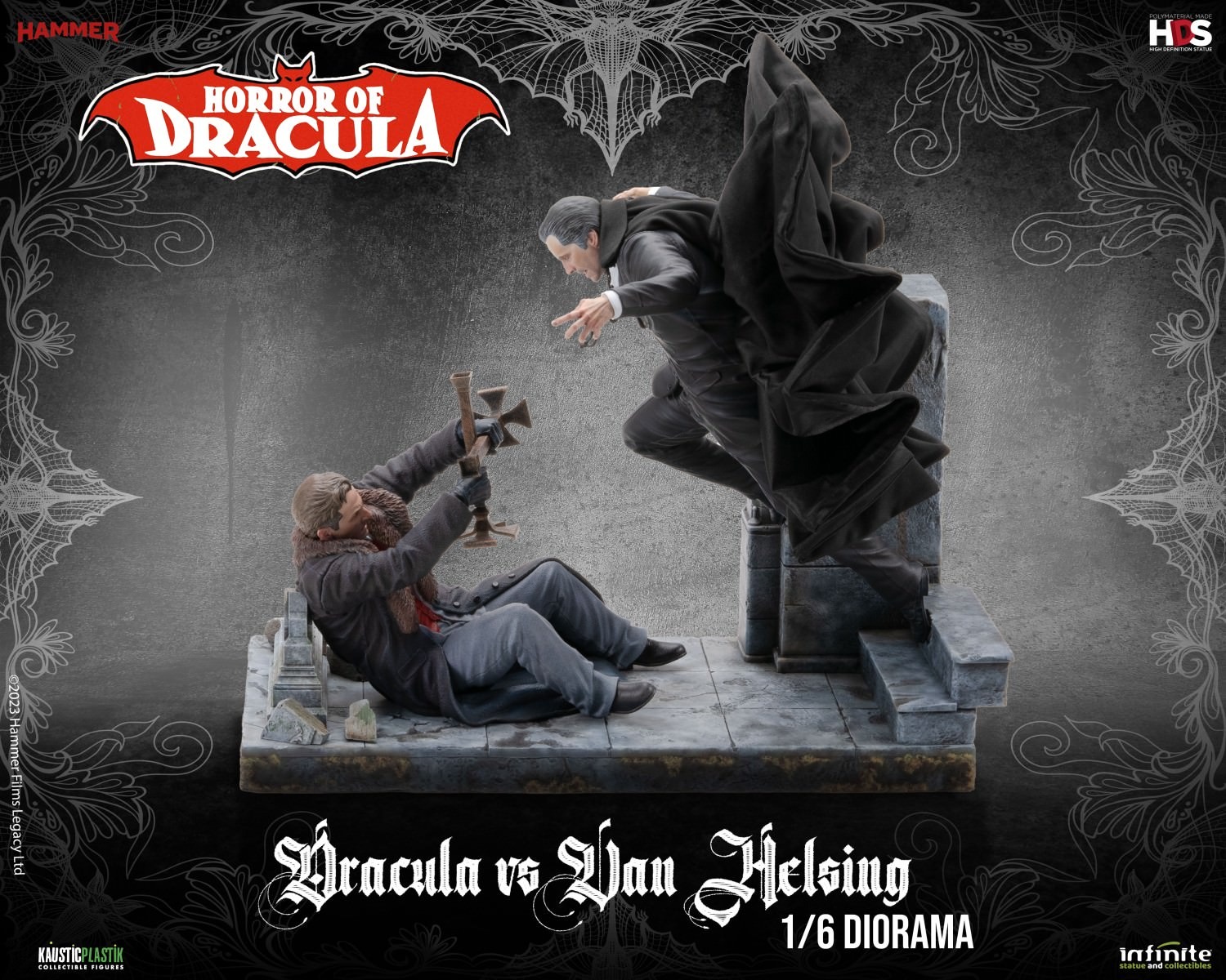 Horror of Dracula – Dracula vs Van Helsing 1:6 Diorama is the extraordinary statue inspired by the 1958 film ‘Horror of Dracula’, by Hammer Films. This incredible diorama from Infinite Statue & Collectibles captures the essence of an epic confrontation.