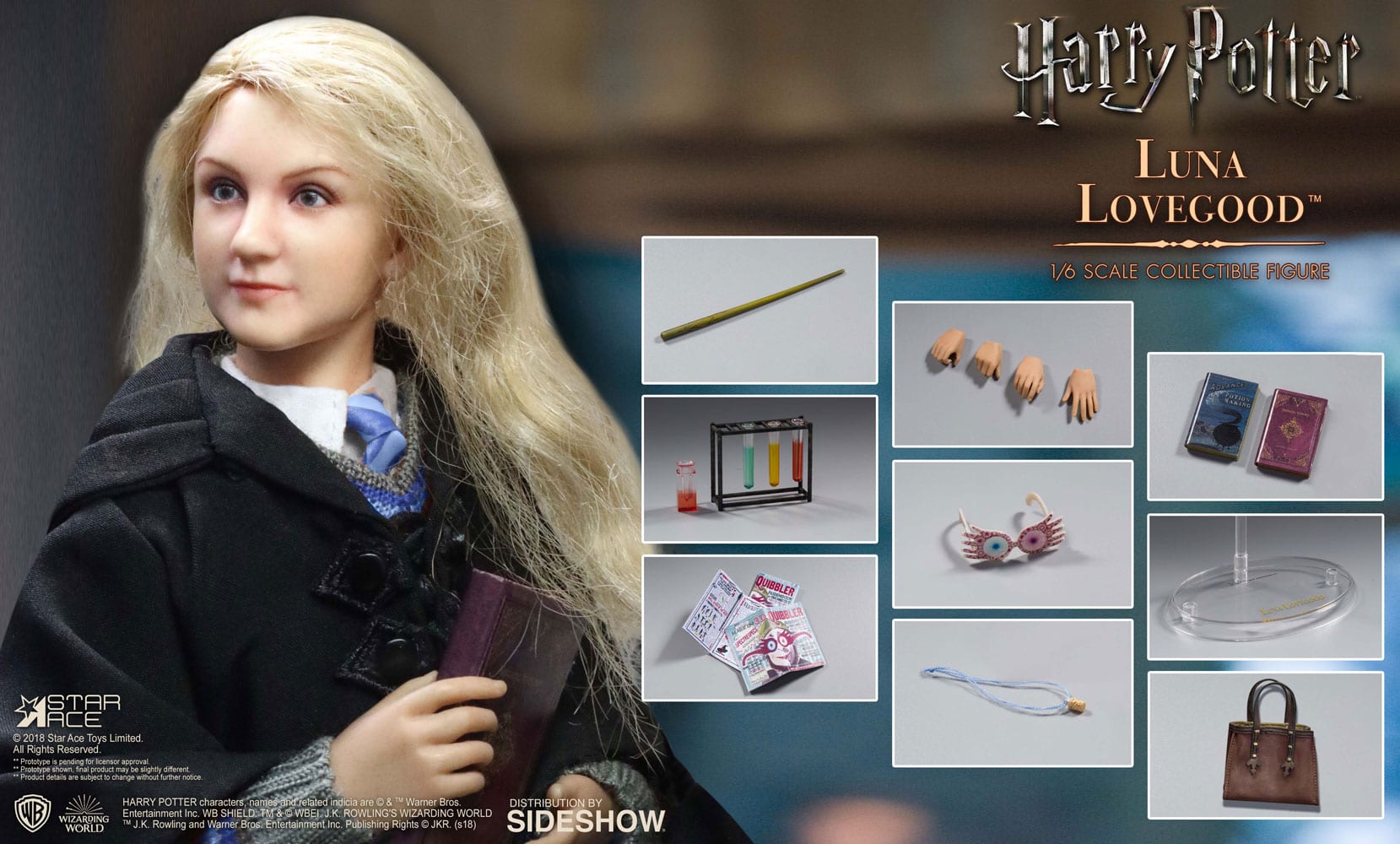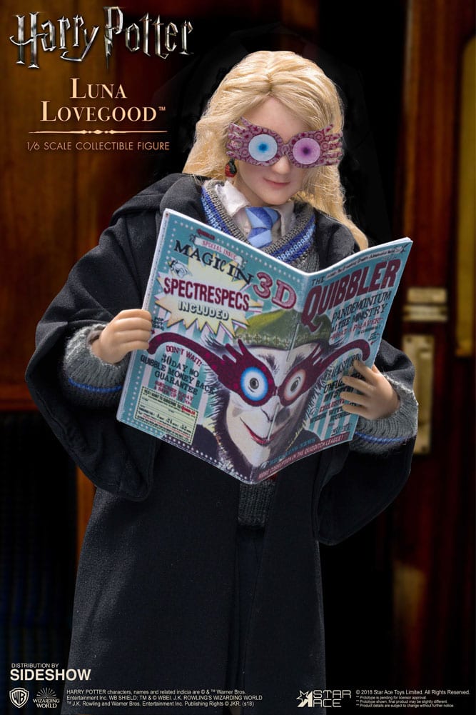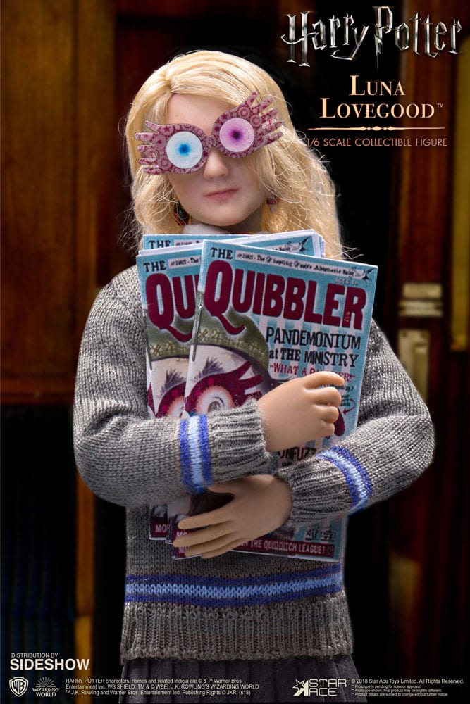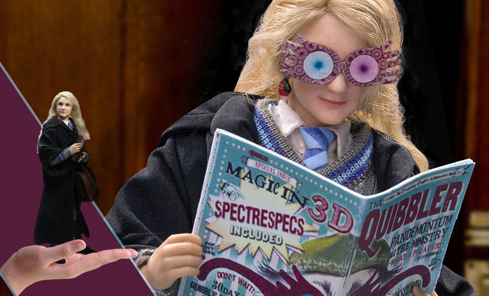 The Sixth Scale Collectible Figure of young Luna includes her Ravenclaw school uniform, Spectrespecs, issues of the Quibbler, dirigible plum earrings, Butterbeer cork necklace, and a Polyjuice potion vial.