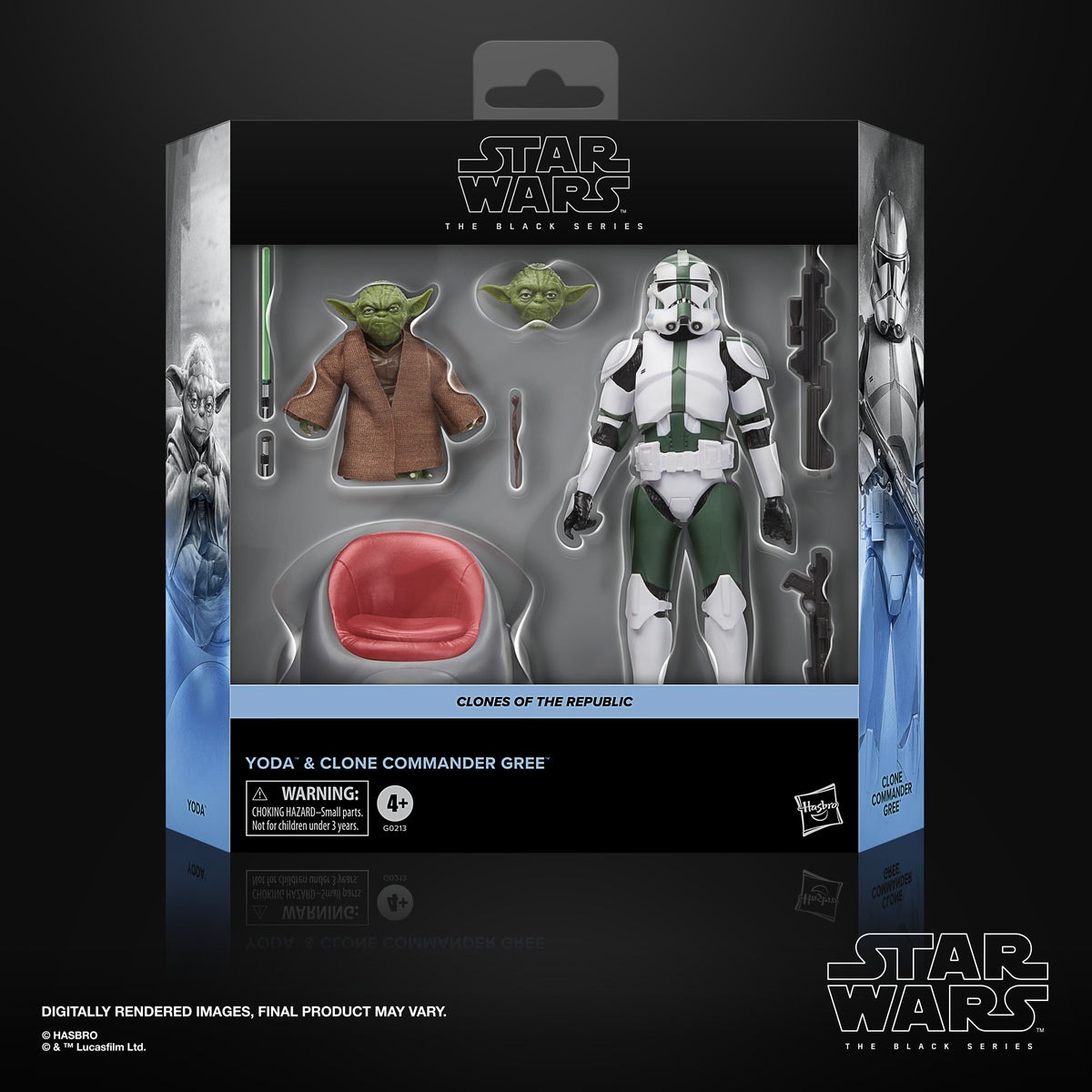- Yoda includes an alternate head and his signature Lightsaber™ and unlit hilt, plus his council chair and walking stick. Clone Commander Gree includes 2 blaster accessories