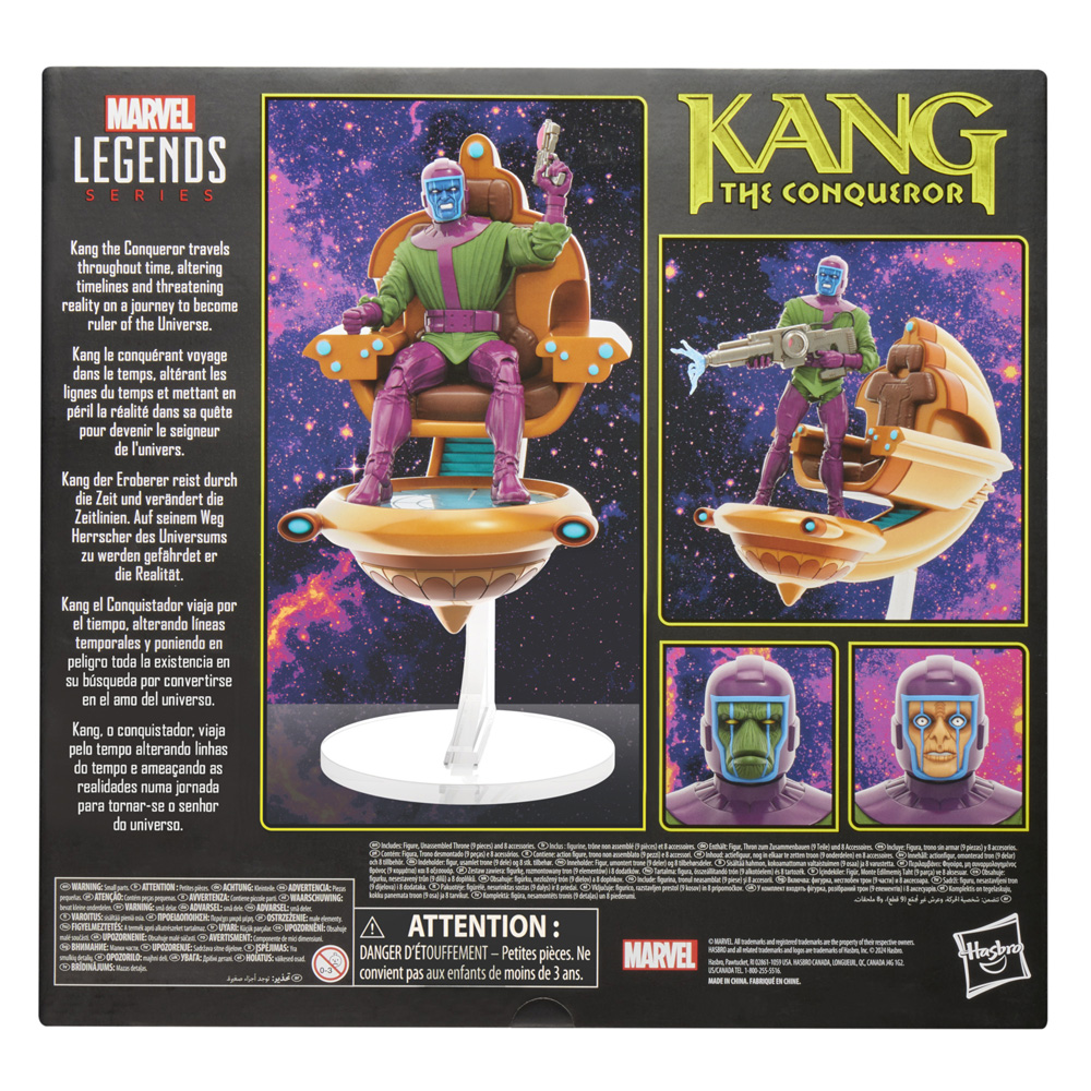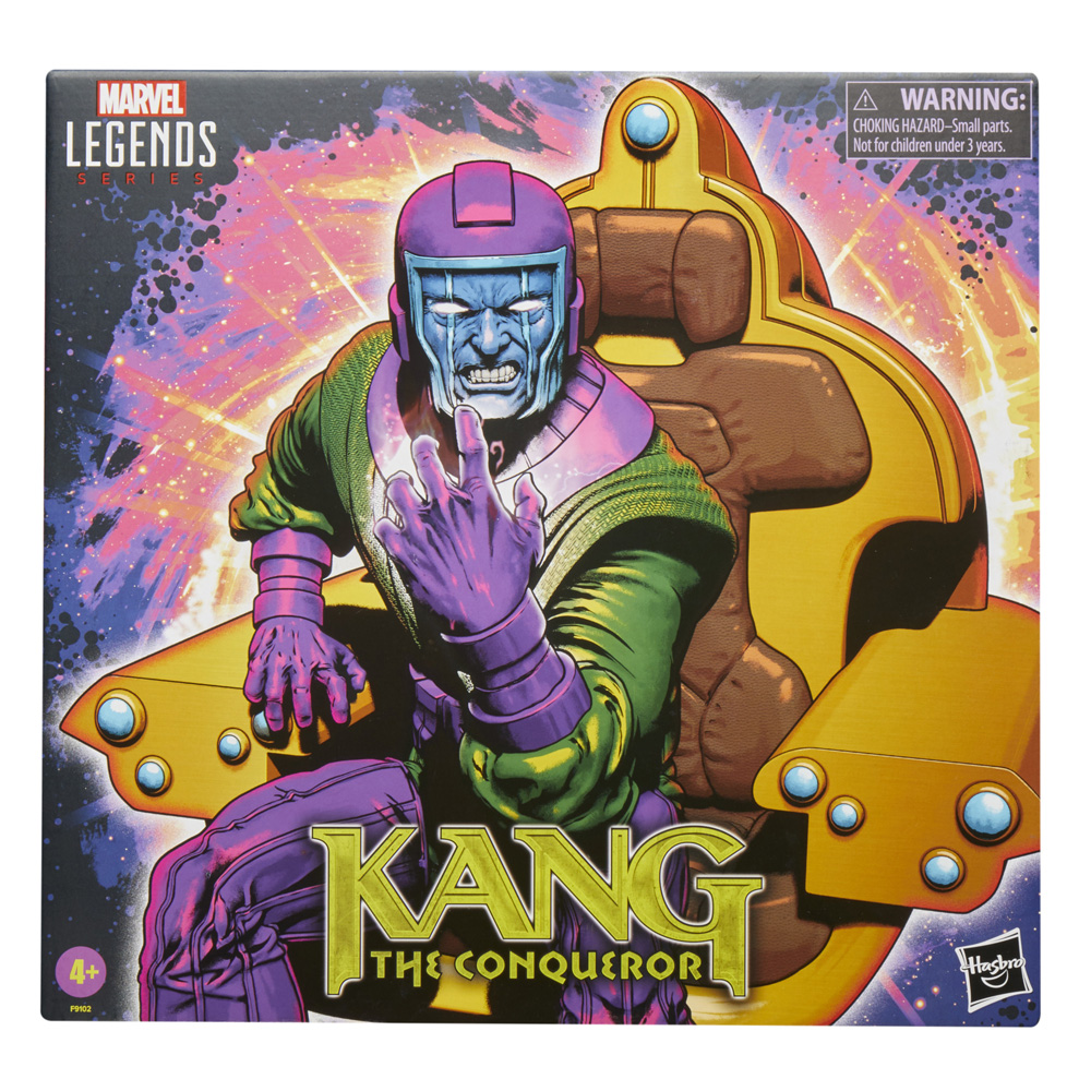 Kang the Conqueror travels throughout time, altering timelines and threatening reality on a journey to become ruler of the Universe. Bring the excitement and wonder of the Marvel Universe to your collection with Hasbro Marvel Legends Kang the Conqueror. Inspired by the character’s appearance in Marvel comic books, this 6-inch scale figure is fully articulated with poseable head, arms, and legs. Comes with an unassembled throne and base (9 pieces.), and 8 accessories including alternate hands, blasters, and 2 character-variation faceplates. Figure comes in a closed box package with premium design and character artwork.