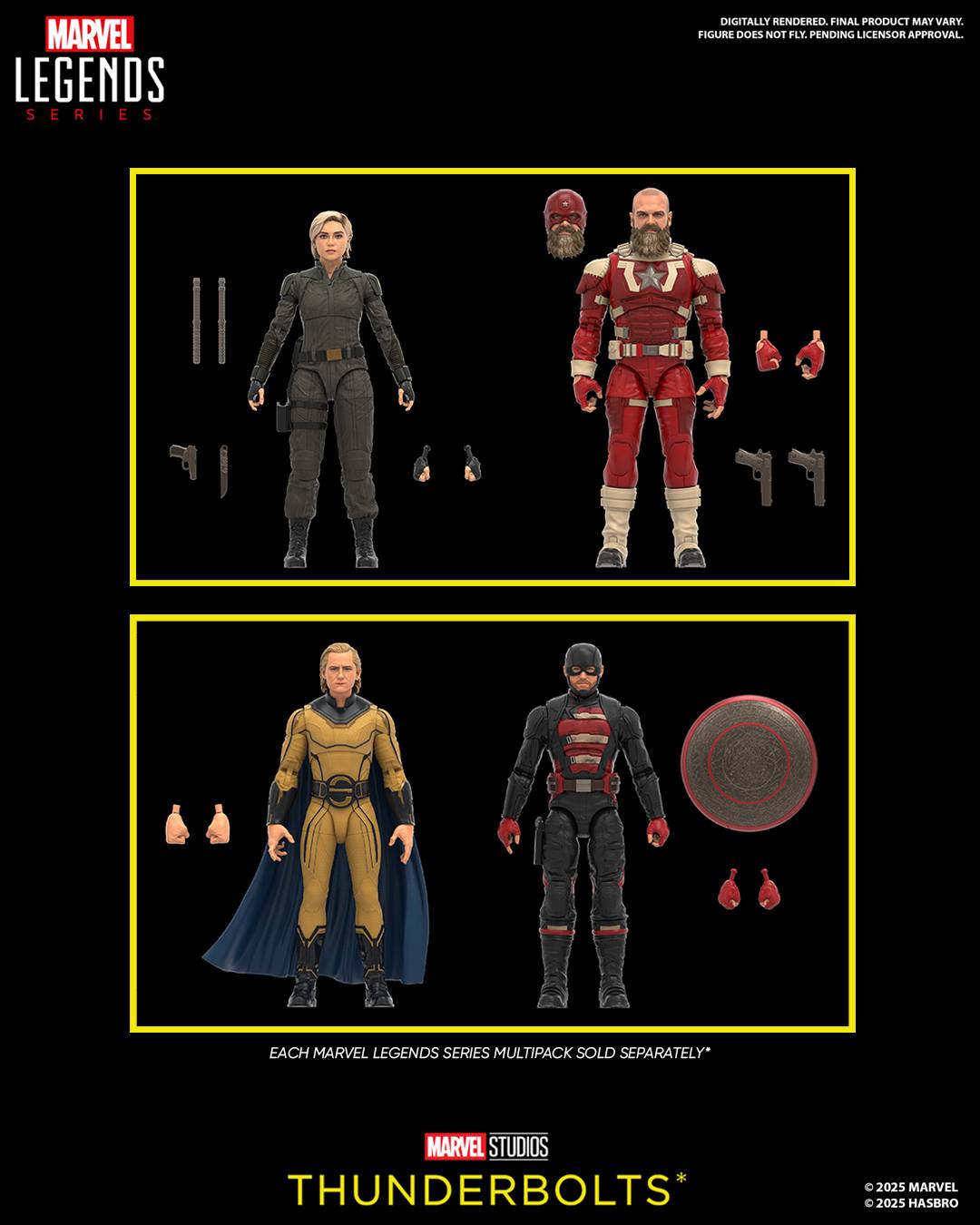 During last night’s Fanstream, Hasbro dropped a first look at upcoming Marvel Legends Series offerings for the Marvel Studios blockbuster Thunderbolts*, with two action figure 2-packs featuring Yelena Belova and Alexei Shostakov along with John Walker and Bob, a.k.a. Sentry (with a spoiler warning for his final design in the movie…); check out the official promotional images here…
