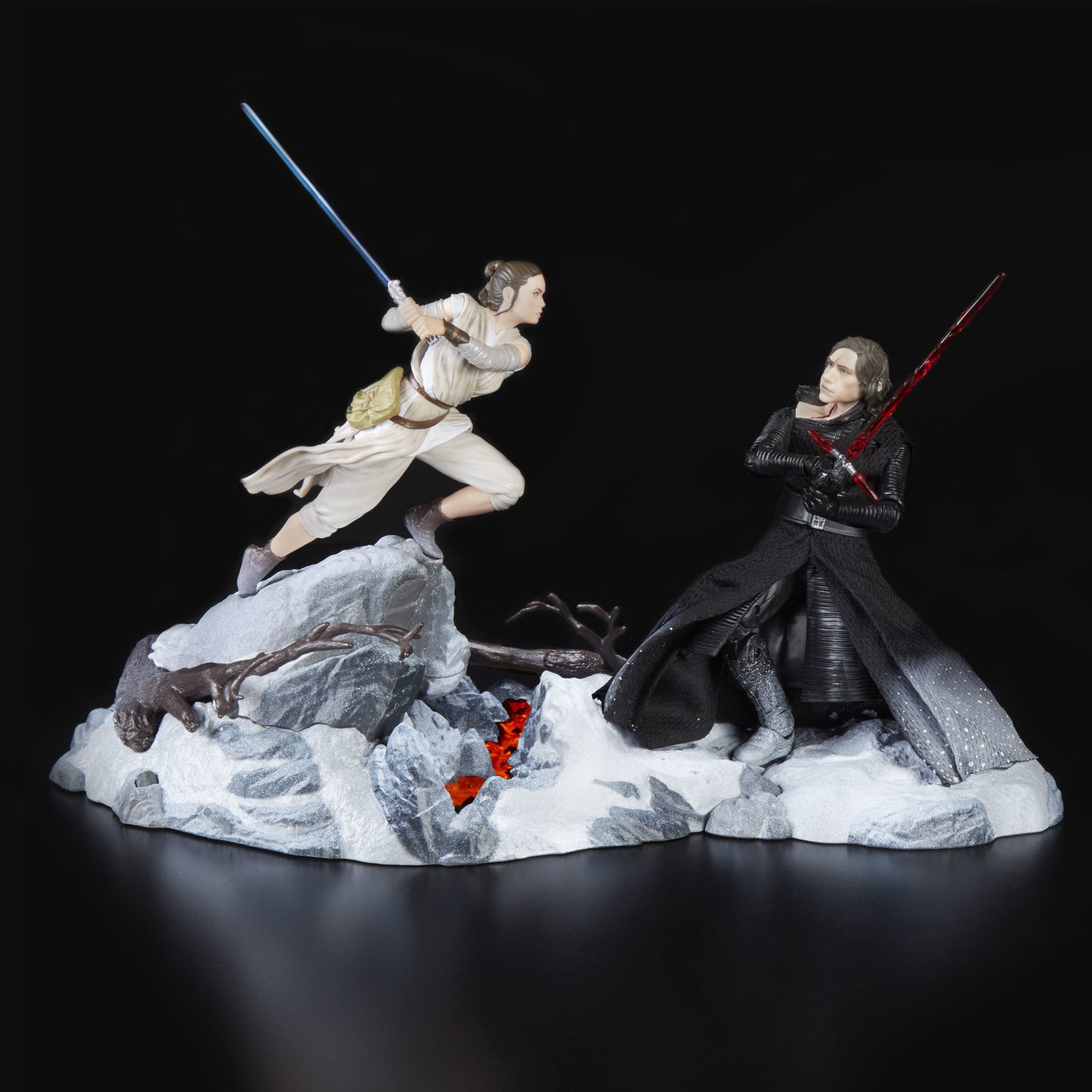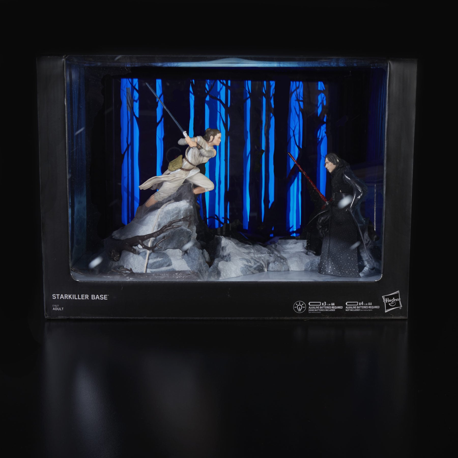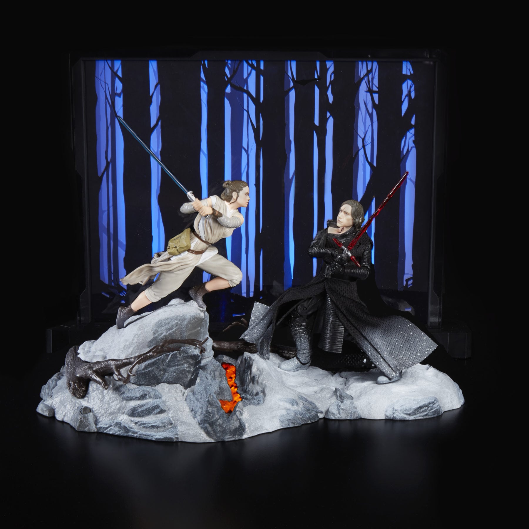 Reimagine key moments from the STAR WARS galaxy with THE BLACK SERIES CENTERPIECE REY (STARKILLER BASE) & KYLO REN FIGURE! Imagine REY battling KYLO REN in the icy forests of STARKILLER BASE in STAR WARS: THE FORCE AWAKENS. Includes a premium, highly-articulated KYLO REN figure, a water mister for steam effects, and an acrylic light-up backdrop, which are all exclusive to this set.